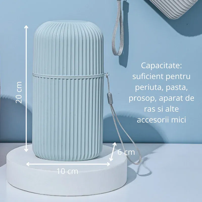 Multumita formei sale cilindrice si dimensiunilor optime, poate fi transportat cu usurinta in geanta, rucsac sau troler. Interiorul sau este suficient de spatios pentru esentialele de igiena, iar exteriorul protejeaza eficient continutul impotriva murdariei sau umezelii.