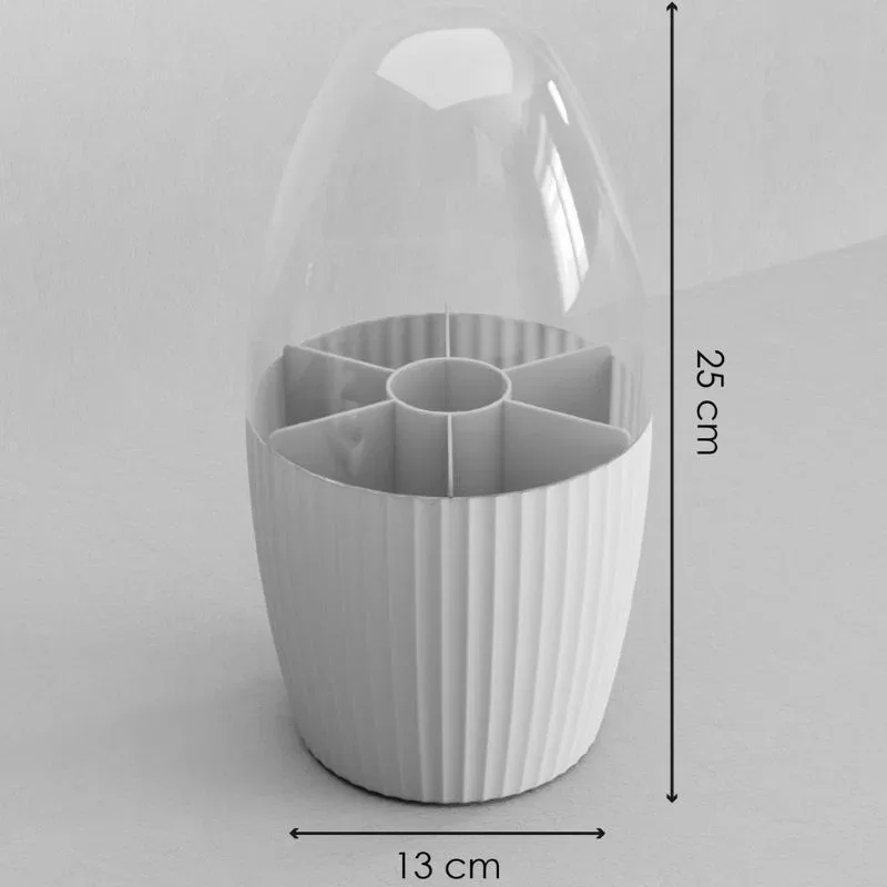 Cu un stil minimalist, organizatorul se integrează perfect în orice decor modern, fie că este folosit pe masa de toaletă sau la birou. Este ideal pentru a depozita farduri, pensule, rujuri și alte accesorii cosmetice, oferindu-ți un acces rapid și organizat la toate produsele tale preferate.