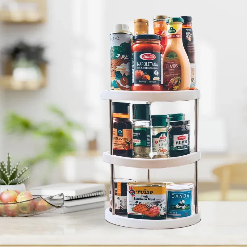 Organizatorul rotativ pentru bucatarie cu 3 nivele este aliatul perfect pentru orice blat, camara sau dulap unde condimentele, sosurile si borcanele mici s-au transformat intr-un puzzle zilnic. Cu designul sau vertical si rotatie la 360°, acest suport iti permite sa accesezi rapid si usor orice produs, fara sa dai totul peste cap.