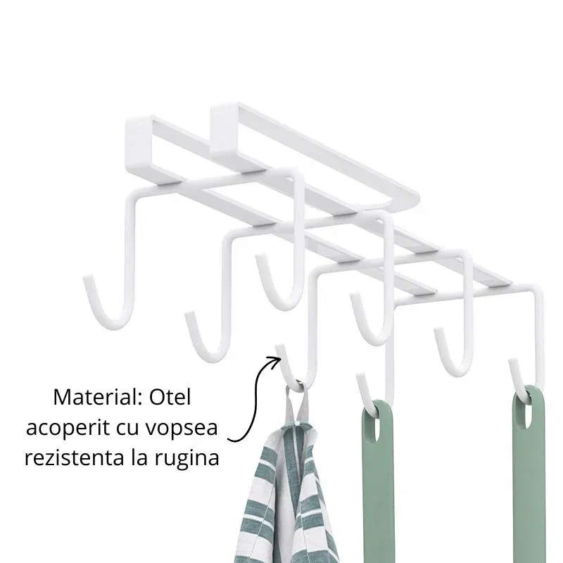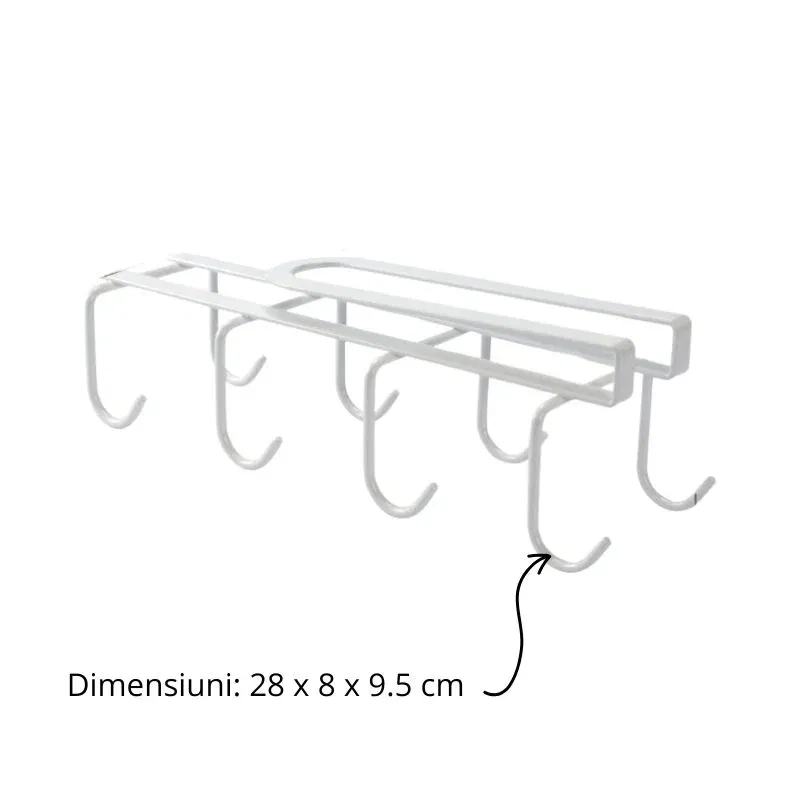 Cele 6 carlige iti permit sa agati rapid cesti, polonice, spatule, linguri de lemn sau ustensile de gatit, fara sa le mai lasi imprastiate prin sertare sau pe blat. Montajul este extrem de simplu – nu necesita gauri sau suruburi. Il poti fixa prin glisare pe polita sau raft si este gata de folosire. In plus, il poti muta oricand in alt loc, in functie de nevoile tale, fiind un accesoriu versatil si usor de integrat.