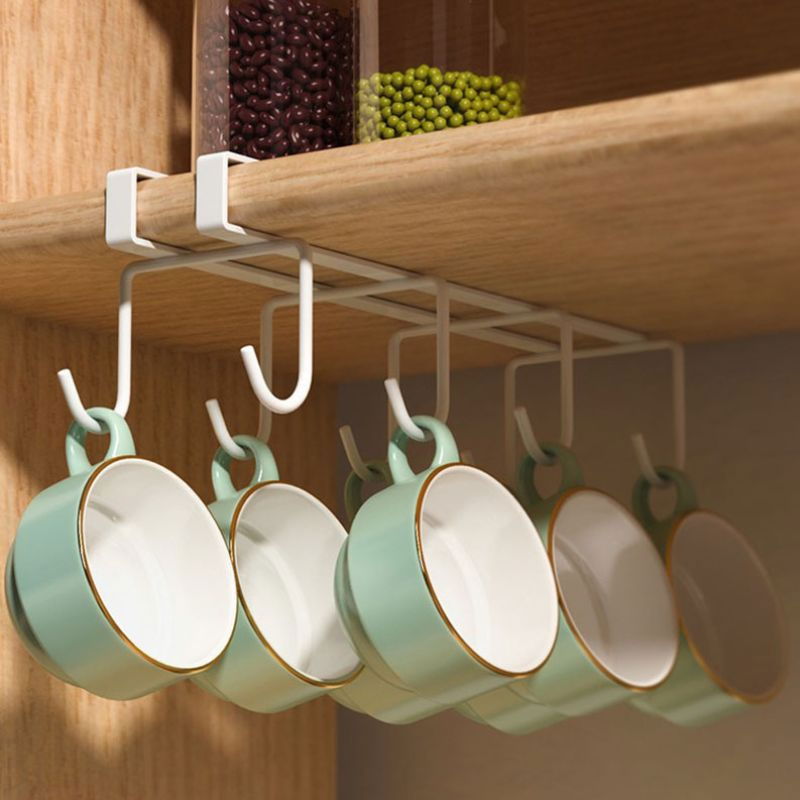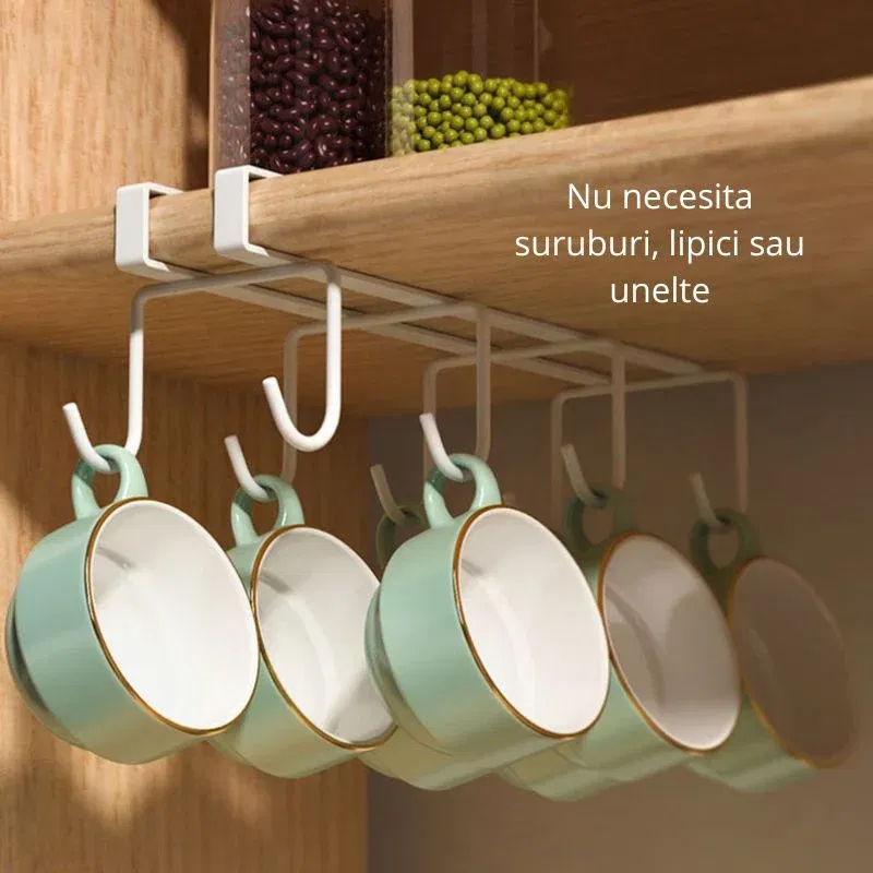 Organizatorul se instaleaza in doar cateva secunde, fara unelte – il aluneci pe marginea unui raft sau polita, iar carligele sunt gata de utilizare. Este ideal pentru depozitarea canilor, a polonicelor sau a ustensilelor de gatit, pastrandu-le la indemana si economisind spatiu valoros.