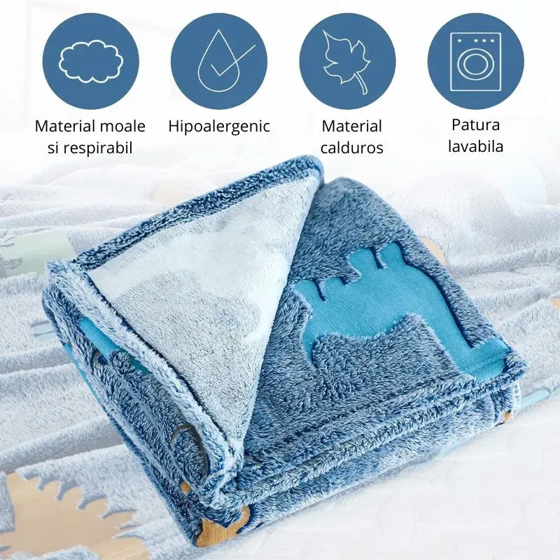 Copii energici si curiosi – Daca micutul tau este fascinat de dinozauri si povesti pline de aventura, aceasta patura ii va transforma somnul intr-o calatorie in era preistorica.
