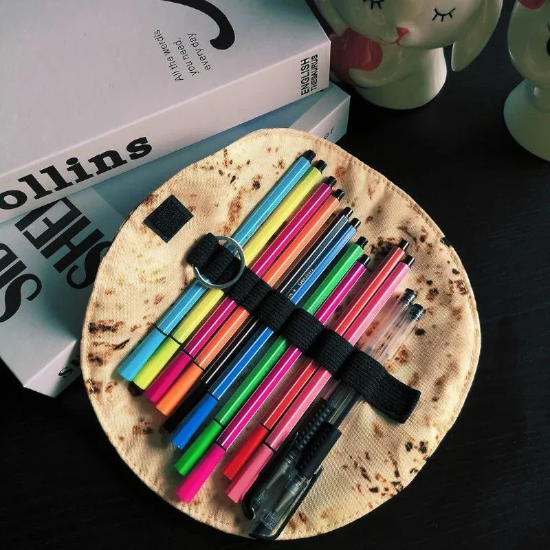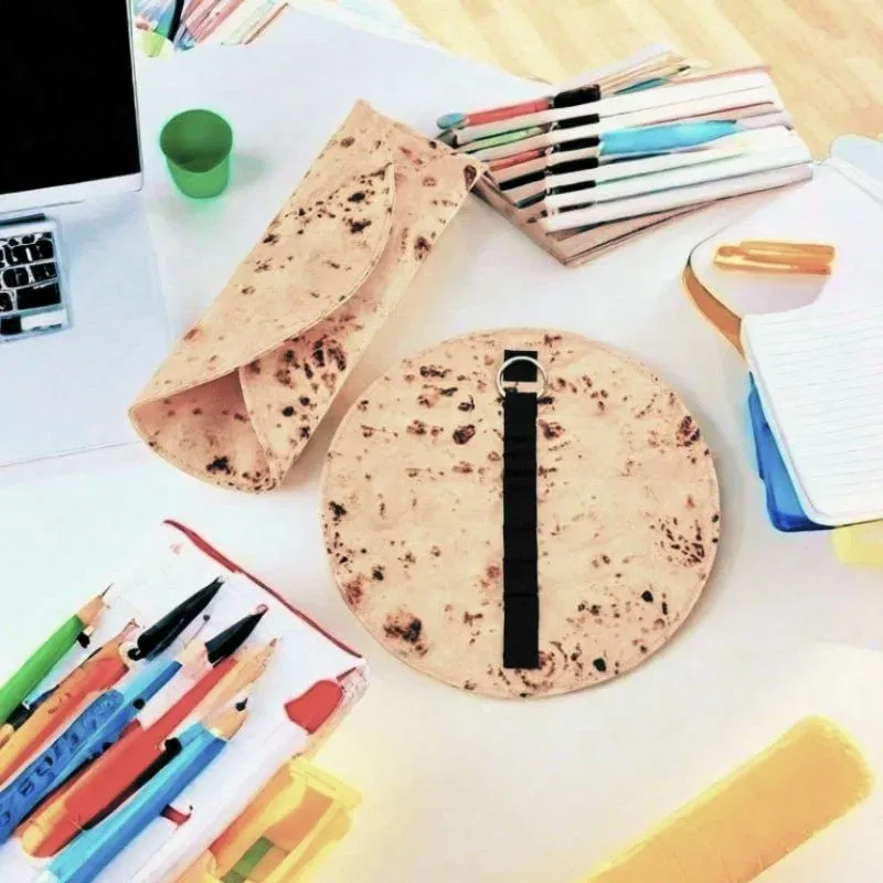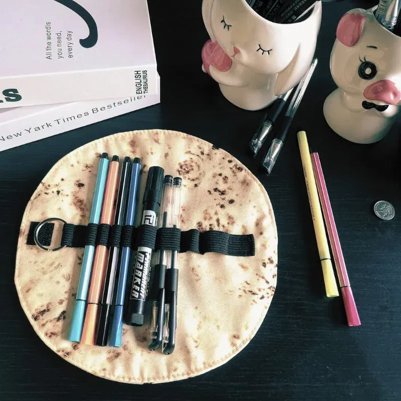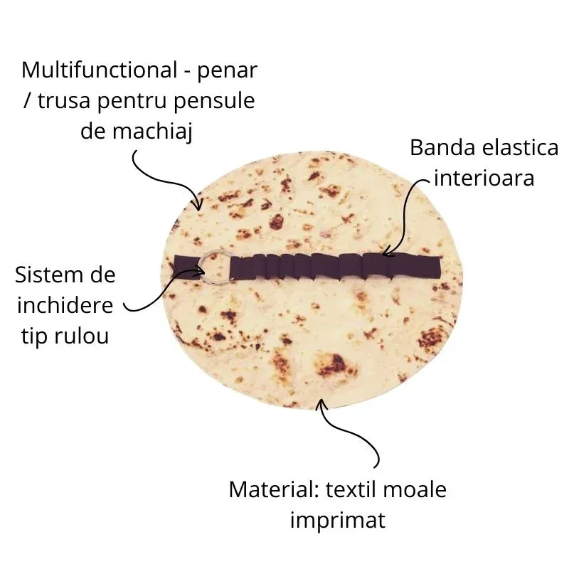 Penarul in forma de lipie este alegerea perfecta pentru cei cu simtul umorului si cu dorinta de a iesi din tipare. Fabricat din material textil moale imprimat si prevazut cu o banda elastica pentru fixarea instrumentelor de scris, acest penar atrage priviri si starneste zambete oriunde l-ai pune. Nu este doar o gluma buna, ci si un accesoriu practic si rezistent.