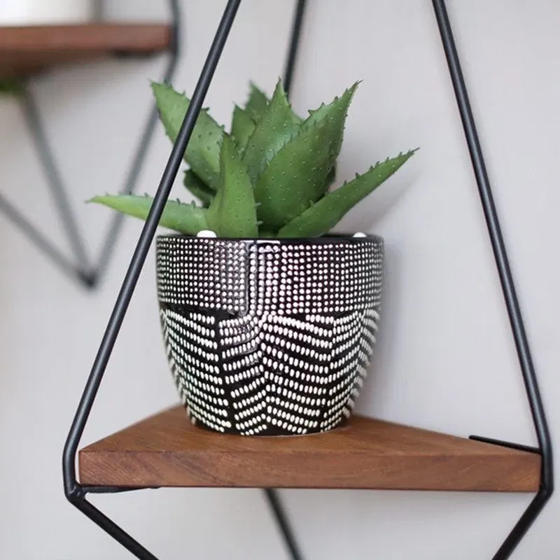 Raftul decorativ de perete este o alegere moderna si stilata pentru organizarea si expunerea plantelor, decoratiunilor sau obiectelor personale. Cu un cadru metalic triunghiular si finisaj din lemn de nuc, acest raft adauga un aspect sofisticat oricarui interior.