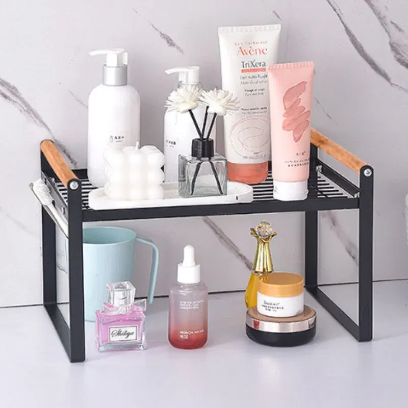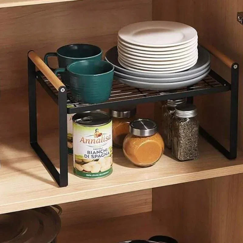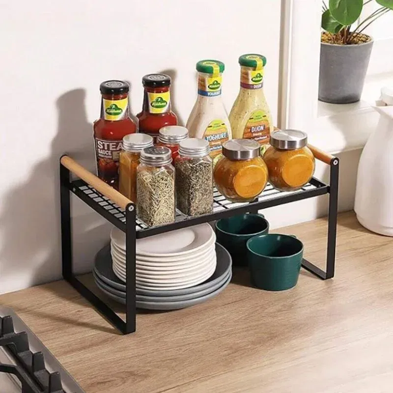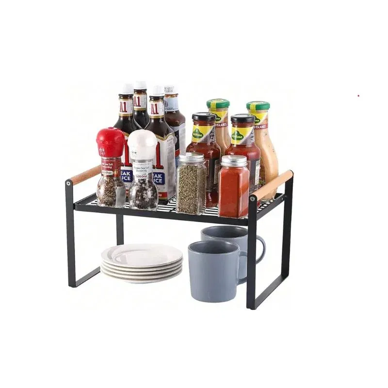 Ideal pentru a tine organizate toate lucrurile mici care iti aglomereaza bucataria: borcane, condimente, sosuri, ustensile. Poti folosi raftul pe masa, in dulap sau chiar pe biroul de acasa pentru alte accesorii utile.