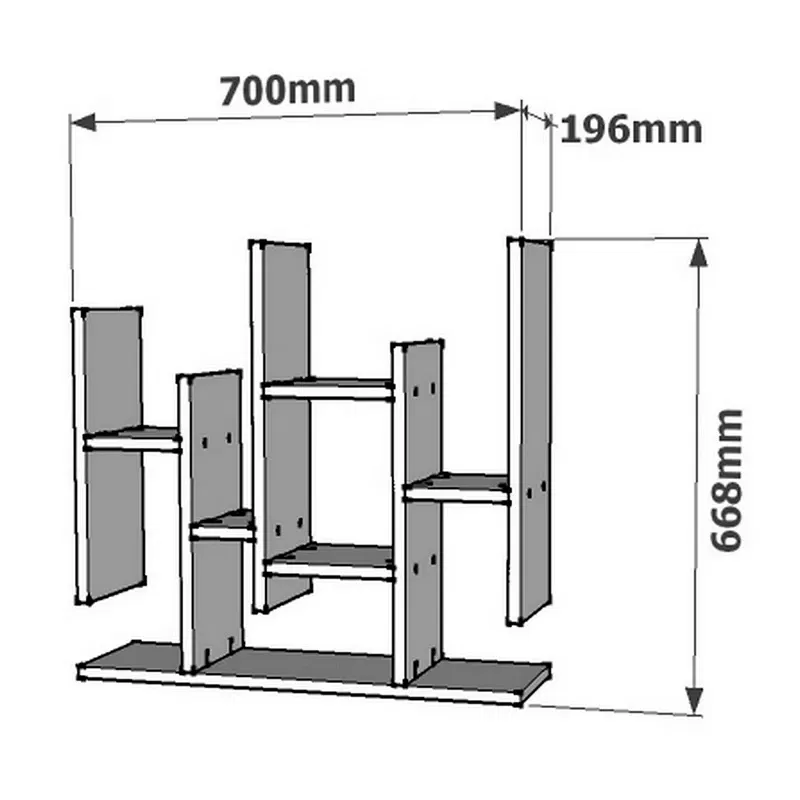 Realizat din placa aglomerata acoperita cu melamina, raftul are o constructie rezistenta si un finisaj elegant in culoarea nucului, potrivindu-se perfect in orice decor. Dispunerea inteligenta a rafturilor creeaza un efect vizual interesant si maximizeaza spatiul disponibil.