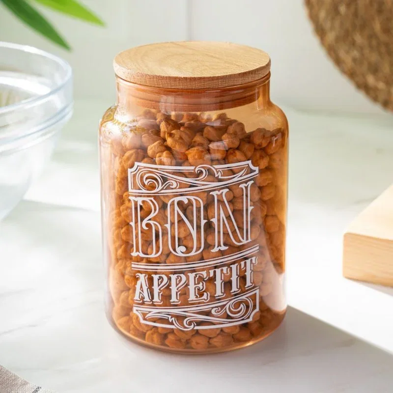 Recipientul din sticlă vintage cu capac din lemn, de culoare maro deschis, este ideal pentru depozitarea alimentelor uscate sau a diverselor ingrediente. Fabricat din sticlă de calitate superioară, acest recipient oferă o soluție estetică și funcțională pentru bucătăria ta.