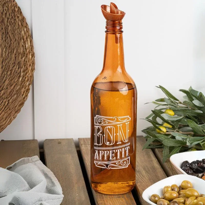 Recipientul de ulei cu capac și design vintage, în culoarea maro, adaugă un plus de stil bucătăriei tale. Fabricat din sticlă rezistentă și dotat cu un capac din plastic, acest recipient păstrează prospețimea și aroma uleiurilor esențiale.