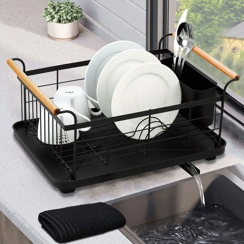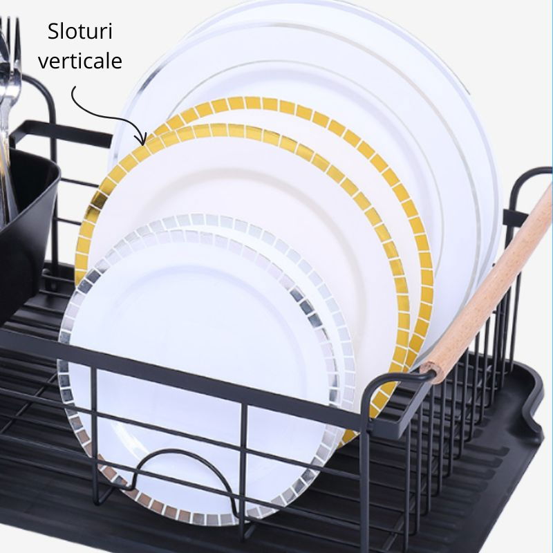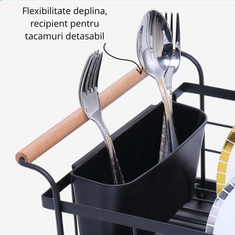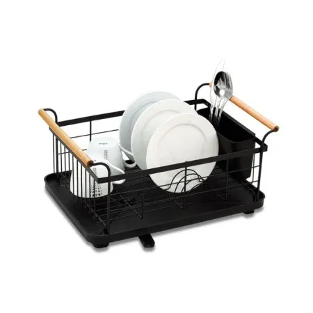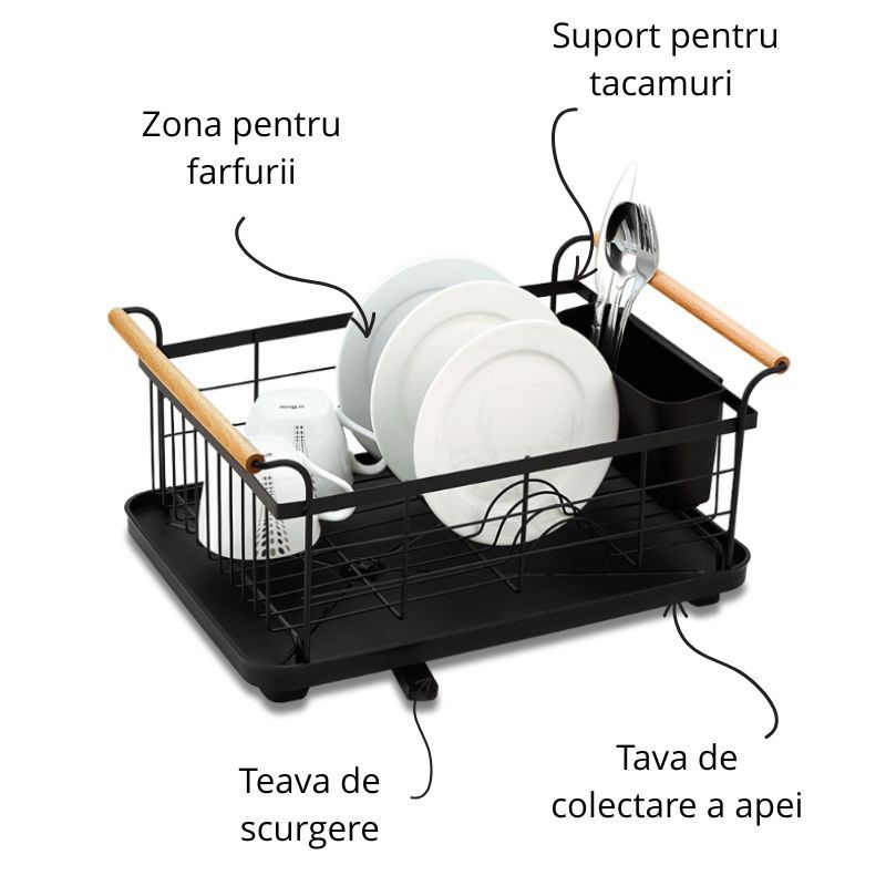 Ideal pentru folosire zilnica langa chiuveta, acest scurgator te ajuta sa usuci vasele rapid si organizat. Tavita colectoare opreste scurgerea apei pe blatul de bucatarie, iar manerele din lemn faciliteaza mutarea si manipularea produsului.