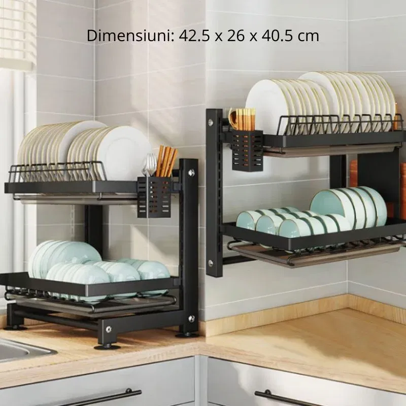 Cele doua niveluri permit separarea farfuriilor, bolurilor, canilor si ustensilelor, iar suporturile laterale sunt perfecte pentru tacamuri si bureti. Fabricat din otel rezistent cu finisaj negru mat, are un aspect modern si minimalist care se potriveste cu orice tip de mobilier.