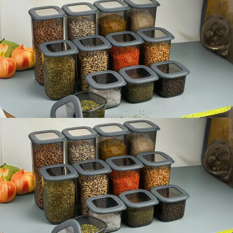Designul compact și dimensiunile variate permit stocarea eficientă a alimentelor, economisind spațiu în frigider sau cămară. Culoarea gri oferă un aspect modern și rafinat, perfect pentru o bucătărie contemporană.