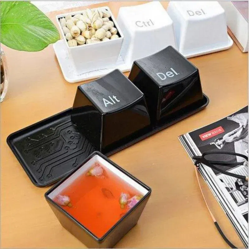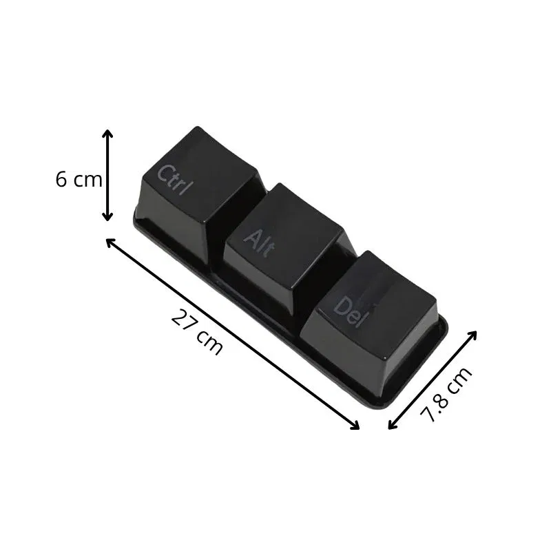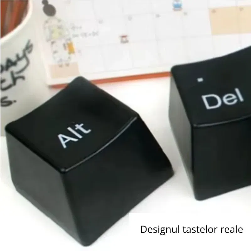 Setul include 3 boluri negre, in forma de taste de calculator: Ctrl, Alt si Del, insotite de o tavita eleganta cu aspect de tastatura care le sustine perfect. Tavita nu doar completeaza aspectul de gadget haios, dar ofera stabilitate si un plus de stil pe orice masa sau birou.