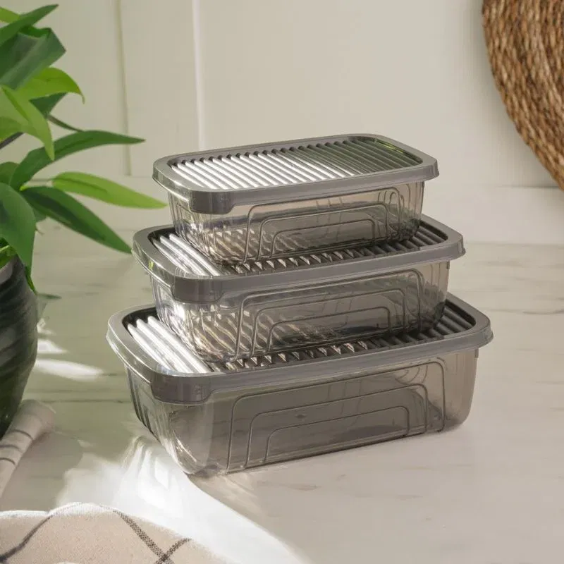 Setul de 3 cutii de depozitare, de culoare gri, este ideal pentru organizarea eficientă a alimentelor și a diverselor obiecte din bucătărie. Fiecare cutie este fabricată din plastic rezistent și dispune de un capac etanș care menține prospețimea alimentelor. Culoarea gri adaugă un aspect elegant și modern, potrivindu-se perfect în orice decor de bucătărie.