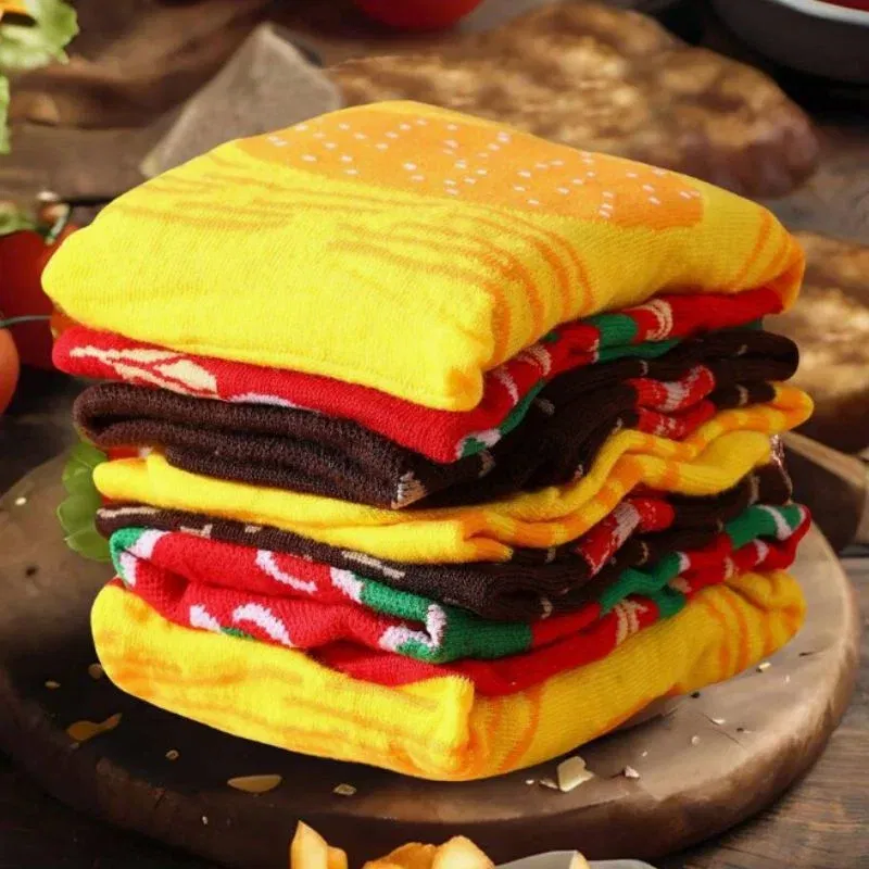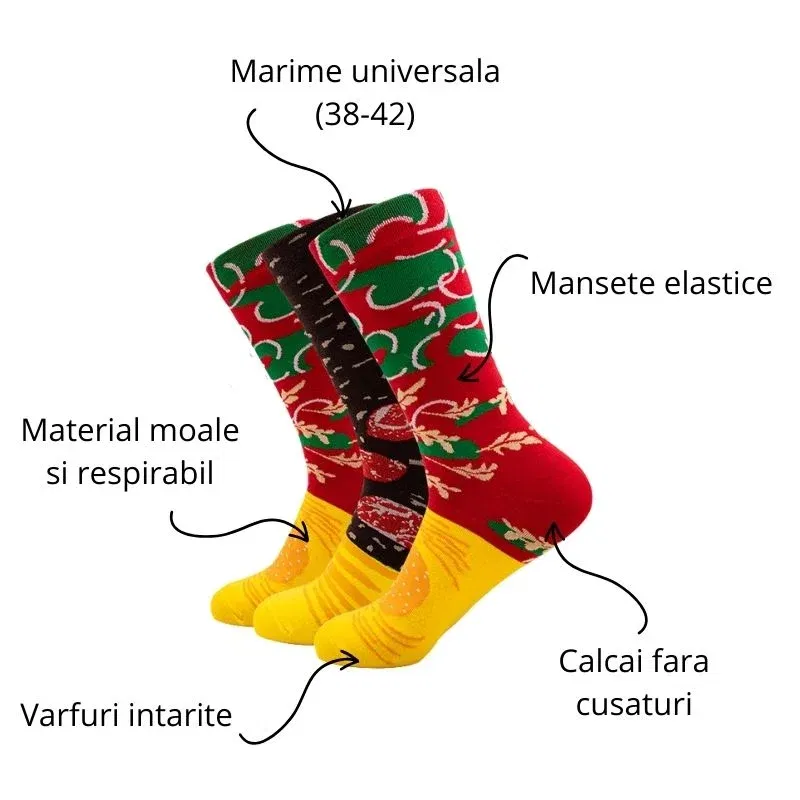 Fabricate dintr-o combinatie premium de bumbac moale, nailon si elastan, sosetele ofera confort pe tot parcursul zilei, fiind potrivite atat pentru zile relaxante acasa, cat si pentru momentele cand vrei sa adaugi o nota vesela tinutei tale. Culorile vii si imprimeurile inspirate din ingrediente de hamburger (paine, salata, rosii, branza) transforma fiecare pas intr-un festin vizual.