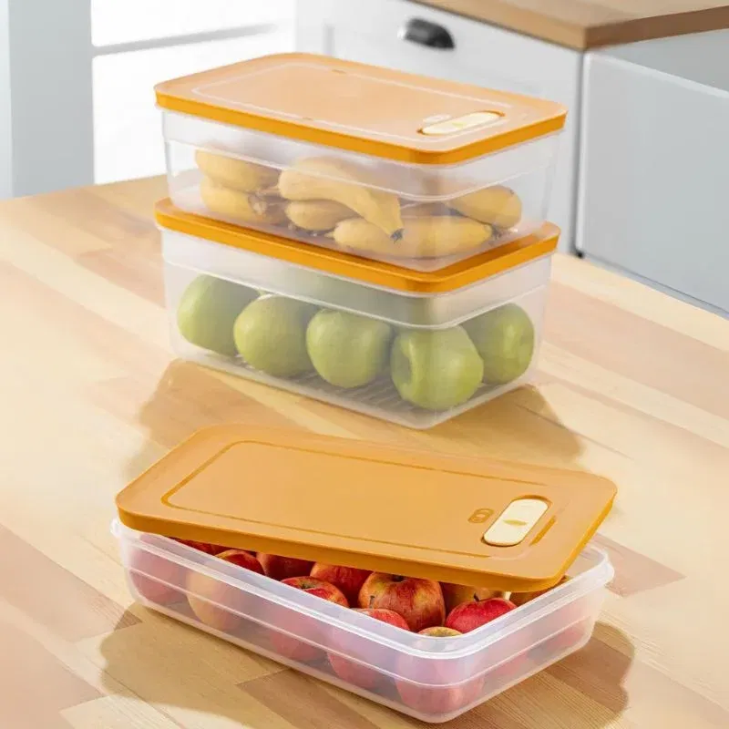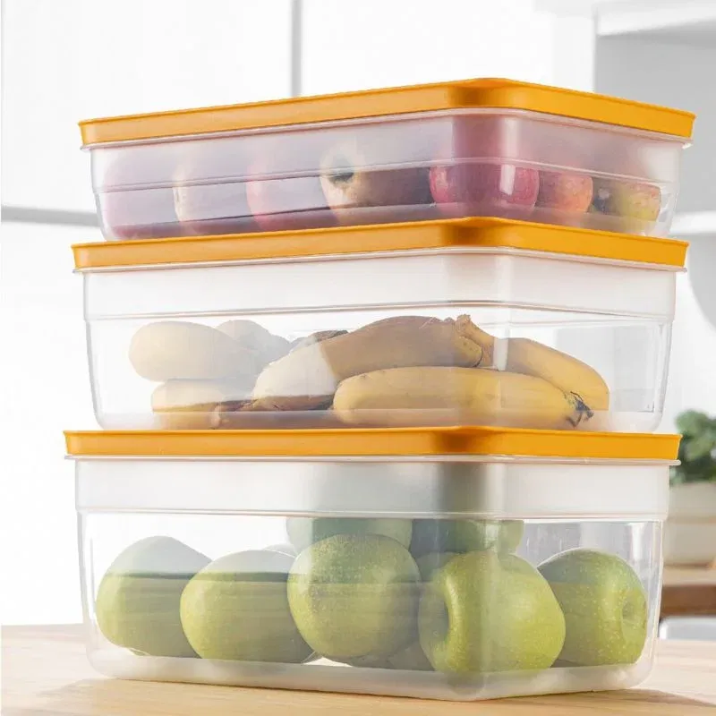 Acest set de cutii de depozitare în culoarea portocalie este soluția perfectă pentru organizarea eficientă a alimentelor în bucătărie sau frigider. Setul include trei recipiente cu capac, fiecare având un sistem de închidere ermetică și ventilare ajustabilă, ideal pentru păstrarea fructelor, legumelor sau a altor produse proaspete. Designul transparent al cutiilor îți permite să vezi rapid conținutul, fără a deschide capacul.