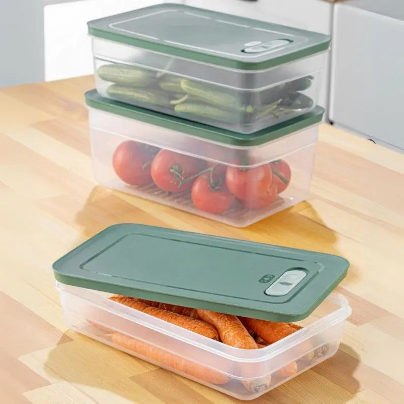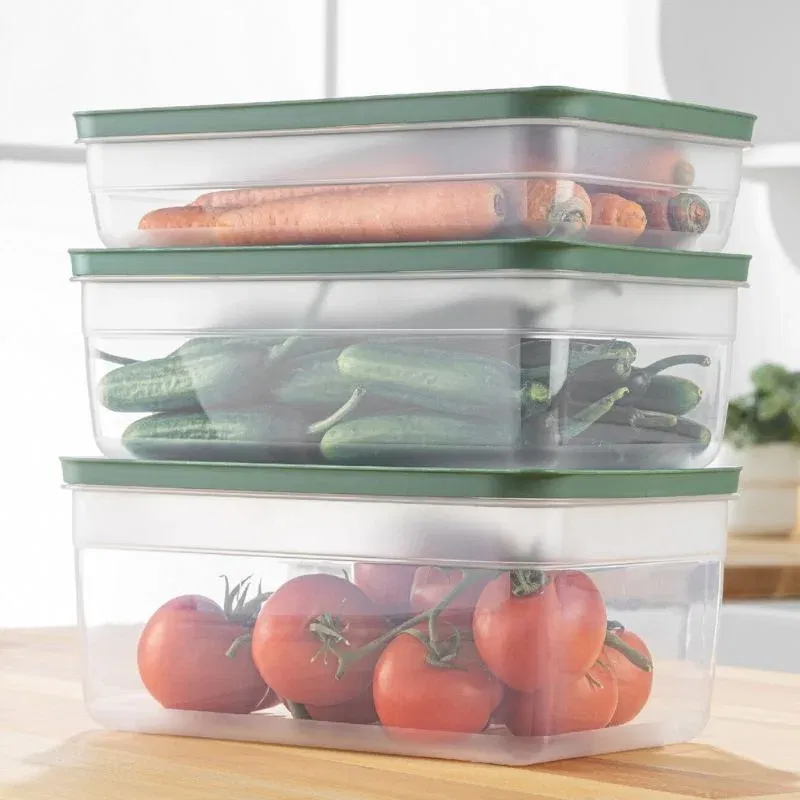 Acest set de cutii de depozitare în culoarea verde este perfect pentru organizarea alimentelor în frigider sau în dulapuri. Setul include trei recipiente de dimensiuni variabile, fiecare dotat cu capac cu sistem de închidere ermetică și ventilare ajustabilă. Designul practic și funcțional permite păstrarea alimentelor proaspete pentru mai mult timp, fiind ideal pentru stocarea legumelor, fructelor sau a altor produse.