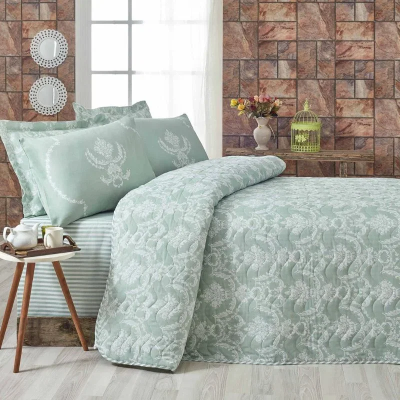 Culoarea verde marin aduce un aer de prospetime si rafinament, fiind perfecta pentru dormitoarele moderne. Setul include o cuvertura generoasa si o fata de perna, toate avand finisaje de calitate superioara si sistem de inchidere cu nasturi pentru un aspect ingrijit.