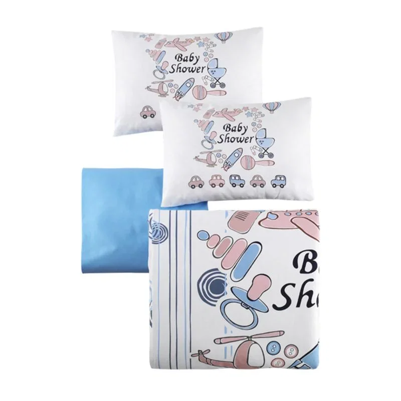 Setul include un cearceaf de pilota de 100x150 cm, un cearceaf plat de aceeasi dimensiune si doua fete de perna de 35x45 cm, realizate pentru a oferi un aspect armonios si ingrijit. Inchiderea cu nasturi la pilota si sistemul plic pentru fetele de perna asigura fixarea sigura si un design elegant.