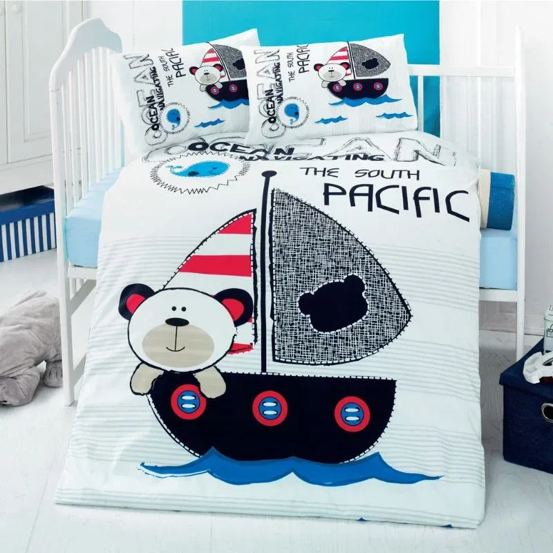 Setul de lenjerie pat copii Pacific - Bumbac, 100x150 cm este special creat pentru a oferi confort si veselie celor mici in timpul somnului. Fabricat din bumbac ranforce de inalta calitate, acest set de lenjerie este moale, respirabil si potrivit pentru pielea sensibila a copiilor.