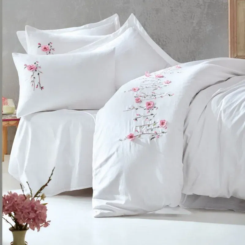 Combinatia de alb si roz este delicata si eleganta, fiind perfecta pentru dormitoare cu accente feminine sau romantice. Tesatura din bumbac satinat este rezistenta, dar in acelasi timp matasoasa, oferind un efect sofisticat si un aspect impecabil. Cu un numar de 211 fire pe inch, acest set are o textura densa si catifelata.