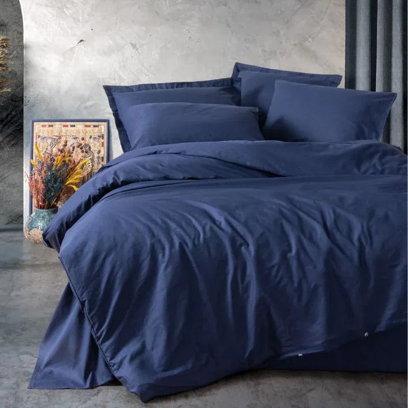 Setul de lenjerie pat dublu Plain - Albastru inchis, bumbac, 200x220 cm este ideal pentru cei care doresc sa adauge un plus de eleganta si profunzime decorului dormitorului. Fabricat din bumbac ranforce de calitate superioara, acest set este moale, respirabil si durabil, asigurand un somn odihnitor in fiecare noapte.