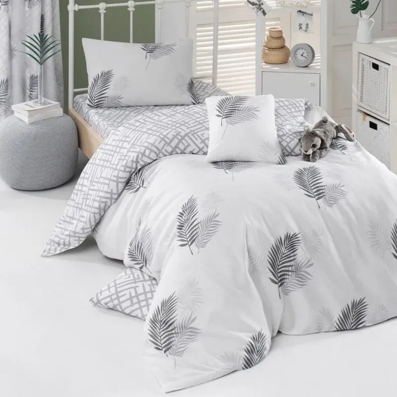 Modelul in nuante de gri si alb adauga un aspect rafinat camerei, fiind potrivit pentru orice stil de decor. Materialul este respirabil si asigura un confort optim in timpul somnului, indiferent de anotimp.