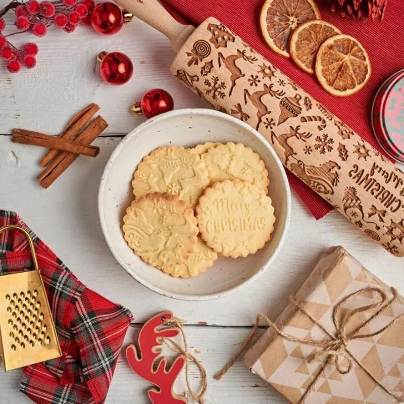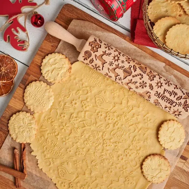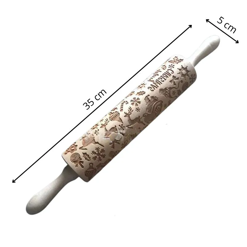 Sucitorul este realizat din lemn si are o lungime de 35 cm cu un diametru de 5 cm. Pe suprafata acestuia sunt gravate diferite motive festive, de la fulgi de zapada si reni pana la mesaje de "Merry Christmas", care imprima un model decorativ pe aluat atunci cand este utilizat. Este perfect pentru a face prajituri, biscuiti si alte delicatese cu un design specific sarbatorilor de iarna.