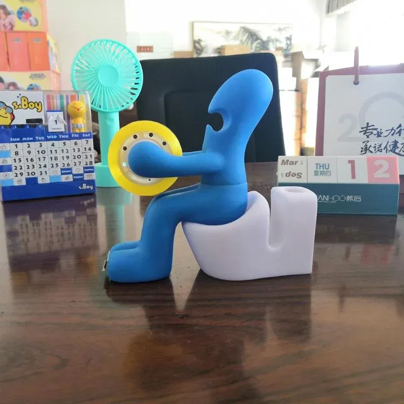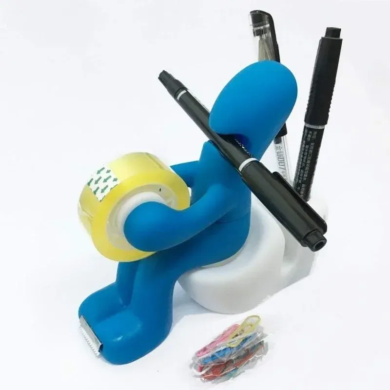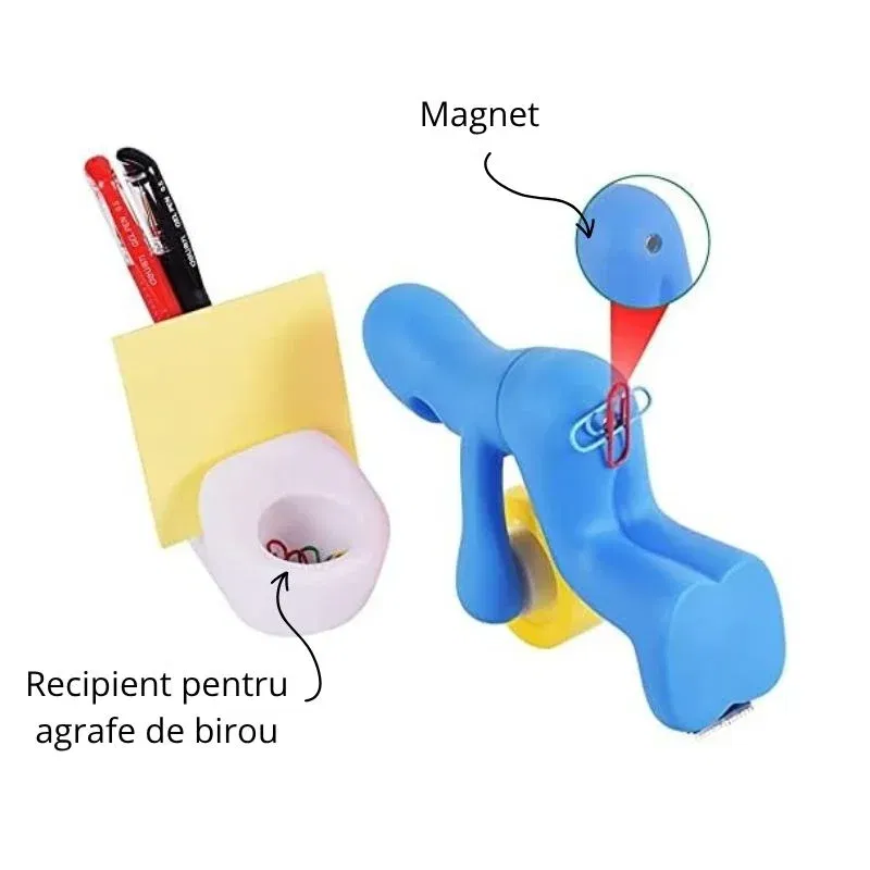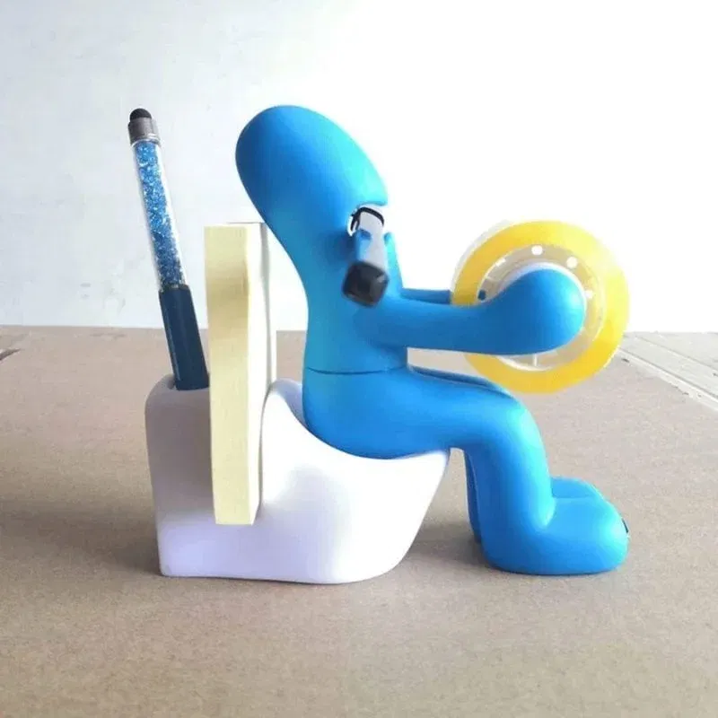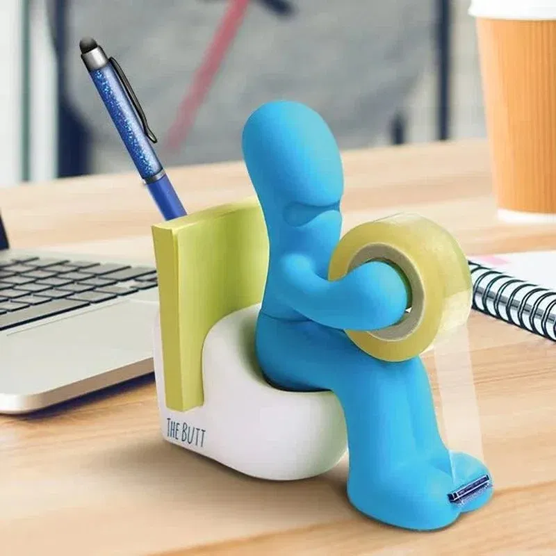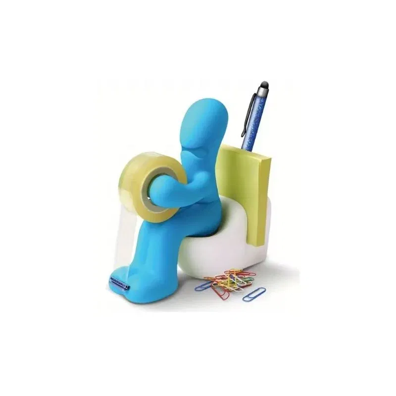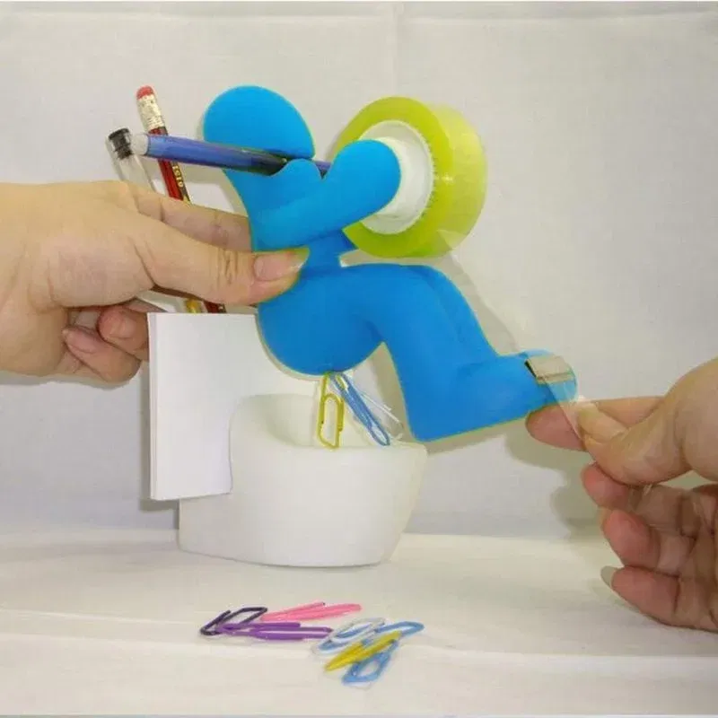 Acest accesoriu are un design ingenios: omuletul asezat pe o toaleta tine rola de banda adeziva ca un profesionist, iar capacul magnetic al „fundului” pastreaza agrafele exact unde ai nevoie de ele. In partea din spate, gasesti spatii special concepute pentru pixuri, creioane sau chiar notite autoadezive. Toaleta, desi simbolica, este functionala: poate ascunde mici obiecte de papetarie, adaugand un plus de discretie si ordine pe birou.
