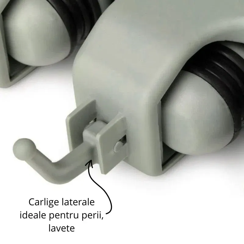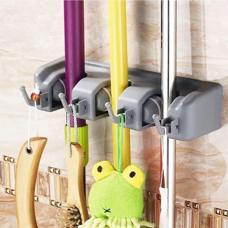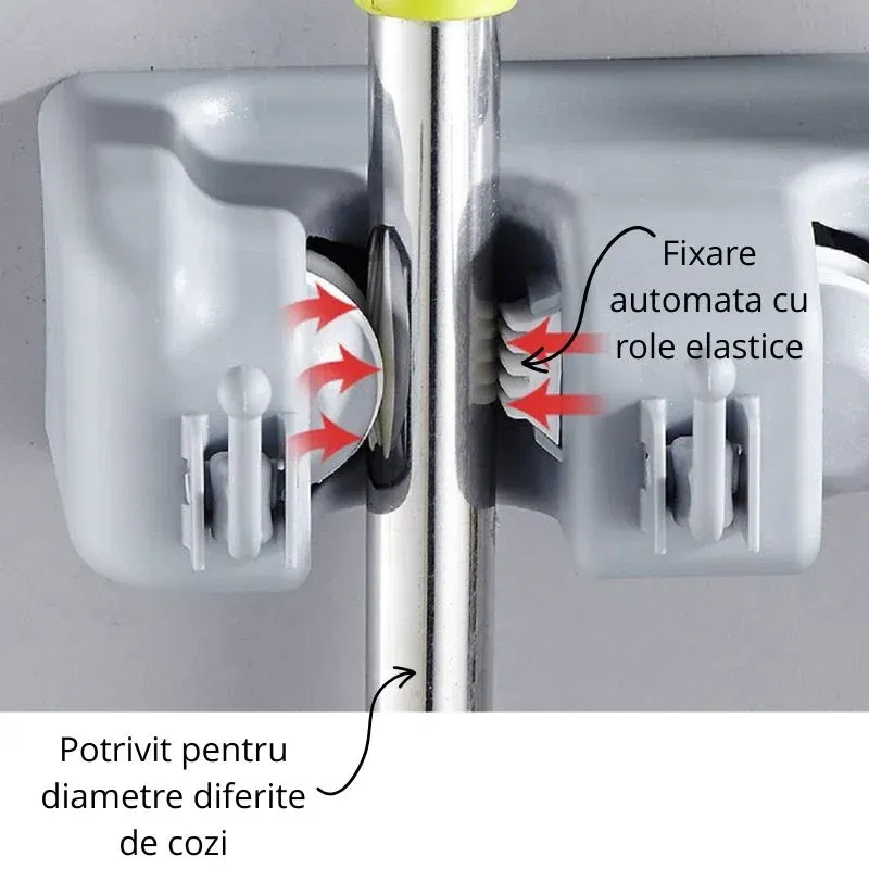 Se monteaza rapid pe perete, fie cu suruburi, fie cu banda adeziva, in functie de suprafata. Este ideal pentru bai, bucatarii, holuri, debarale sau garaje. Fixeaza mopul, matura, racleta sau orice alt obiect cu coada, eliminand riscul ca acestea sa cada sau sa ocupe inutil podeaua. Un sistem eficient si elegant de a mentine casa ordonata.