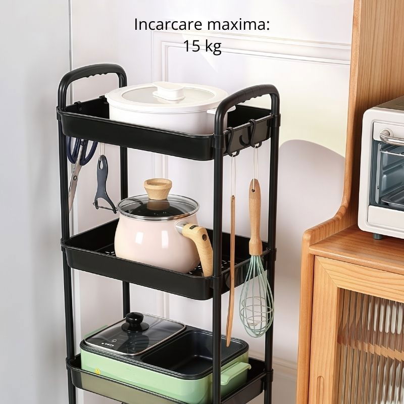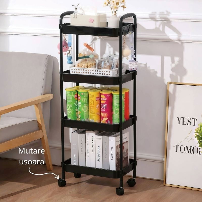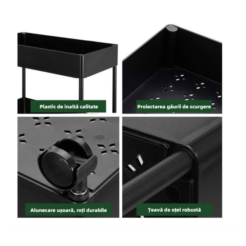 Se amplaseaza oriunde ai nevoie de spatiu suplimentar si poate fi mutat fara efort. Ideal pentru depozitare usoara si acces rapid, fie ca e vorba de condimente in bucatarie sau produse cosmetice in baie.