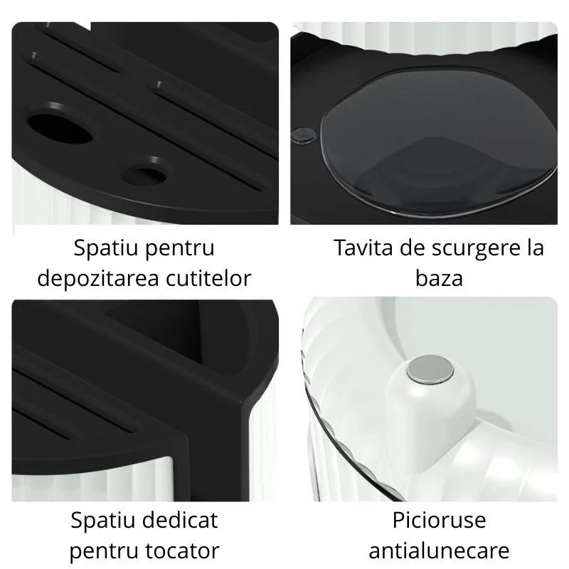 Suportul rotativ pentru ustensile de bucatarie este un must-have pentru orice bucatarie moderna. Cu un design ingenios, compartimentat si rotativ 360°, acest organizator transforma complet modul in care depozitezi cutitele, lingurile, foarfecile sau tocatoarele. Realizat din material plastic rezistent, in combinatie cu elemente antiderapante si un tava de scurgere detasabila la baza, acest suport imbina estetica, functionalitatea si igiena intr-un mod inteligent.