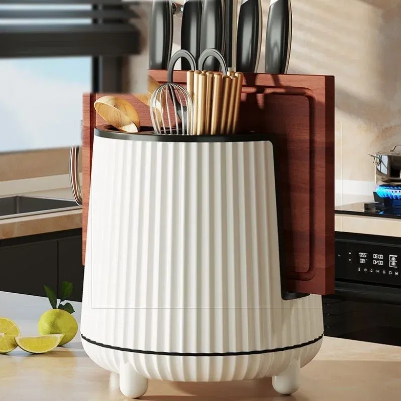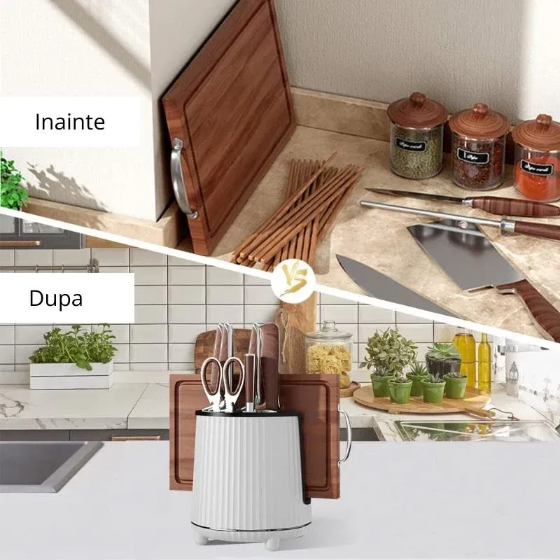 Produsul este compartimentat special pentru fiecare tip de ustensila – de la tacamuri si betisoare, la foarfeci, cutite, pietre de ascutit si tocatoare. Are inclus un suport dedicat pentru tocatoare, fante pentru cutite de diferite dimensiuni si adancimi, si un spatiu larg pentru ustensile diverse. Tava de scurgere de la baza previne acumularea apei si mentine ustensilele curate si uscate, iar piciorusele antialunecare garanteaza stabilitate chiar si pe suprafetele ude.
