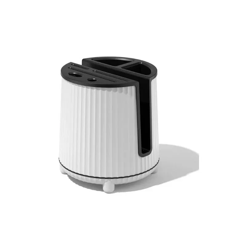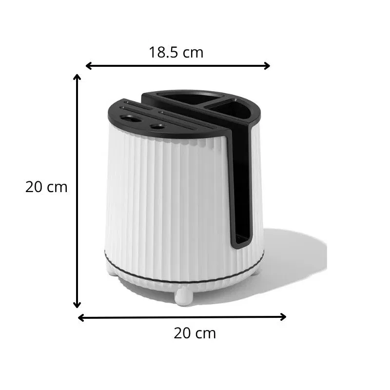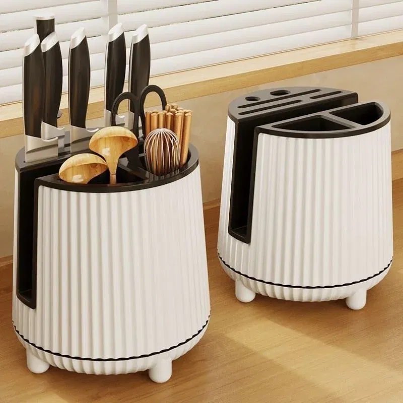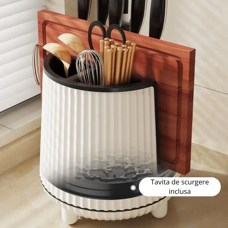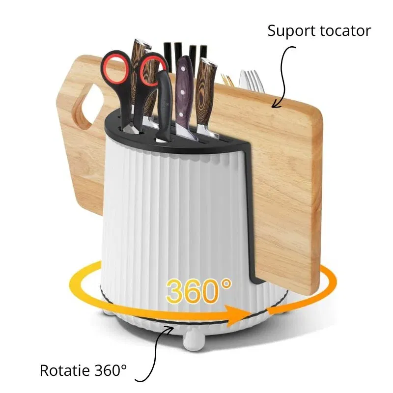 Suportul rotativ pentru ustensile de bucatarie este un must-have pentru orice bucatarie moderna. Cu un design ingenios, compartimentat si rotativ 360°, acest organizator transforma complet modul in care depozitezi cutitele, lingurile, foarfecile sau tocatoarele. Realizat din material plastic rezistent, in combinatie cu elemente antiderapante si un tava de scurgere detasabila la baza, acest suport imbina estetica, functionalitatea si igiena intr-un mod inteligent.