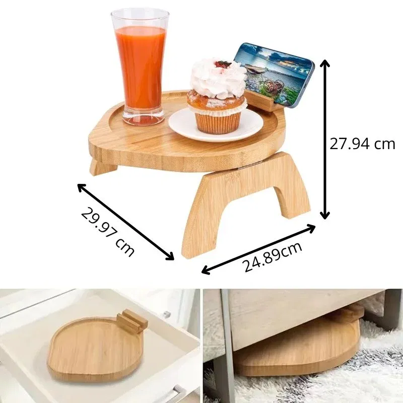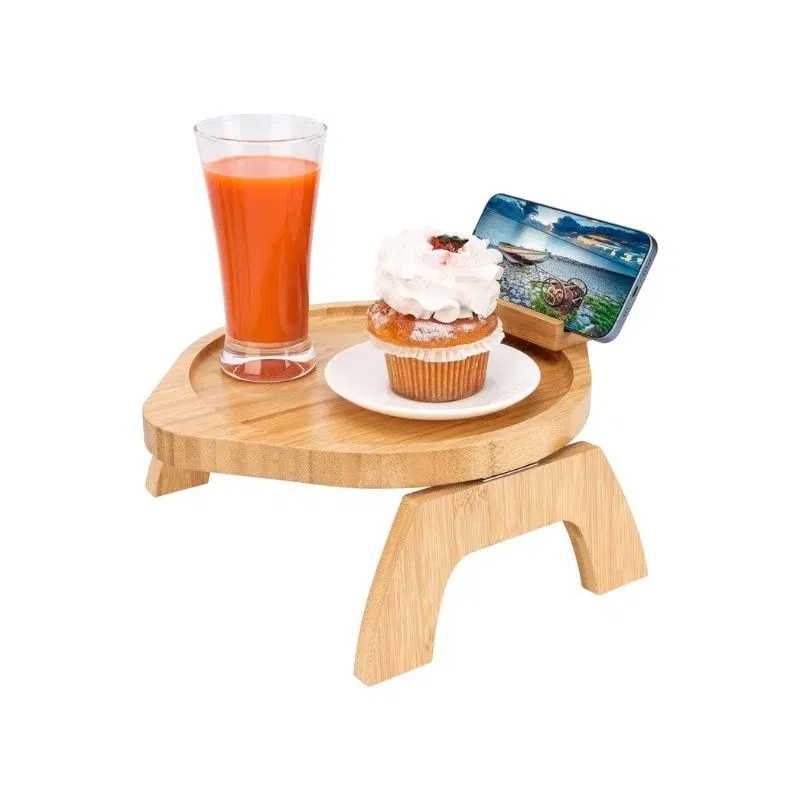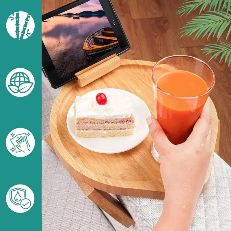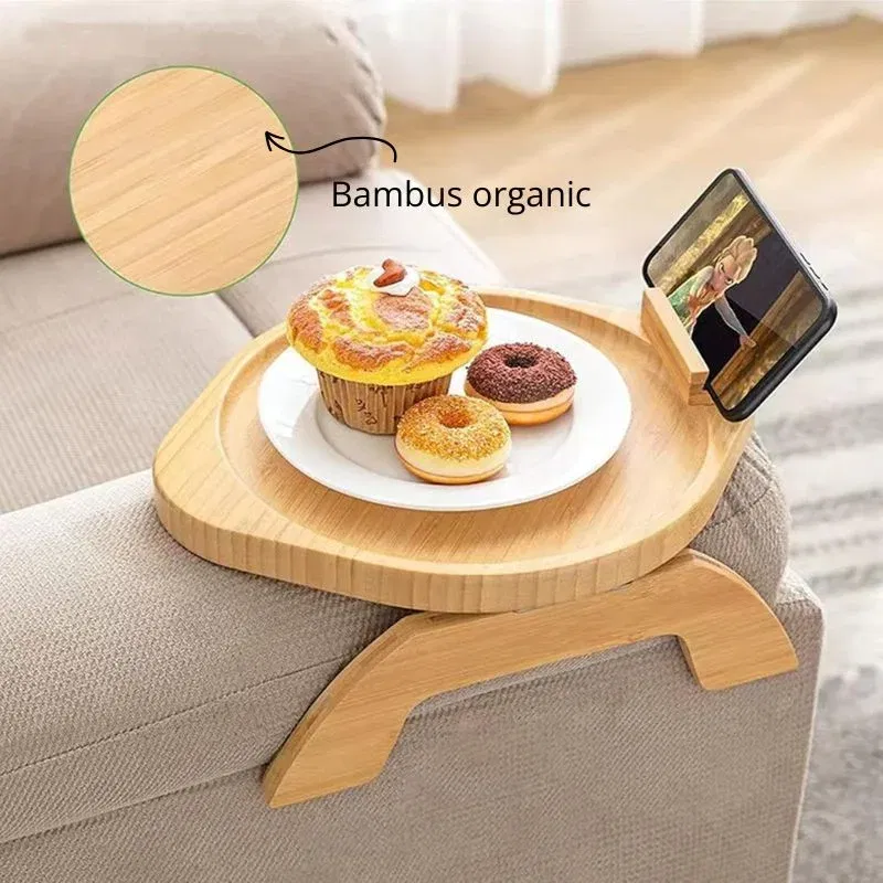 Tava de servire din lemn pentru brat canapea, cu suport telefon