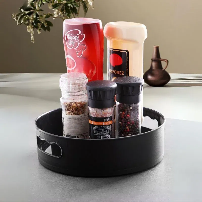Sistemul rotativ asigură accesul rapid la toate obiectele, economisind timp și spațiu. Dacă dorești un accesoriu practic și elegant pentru organizarea spațiului tău, tava rotativă neagră este alegerea ideală pentru tine.