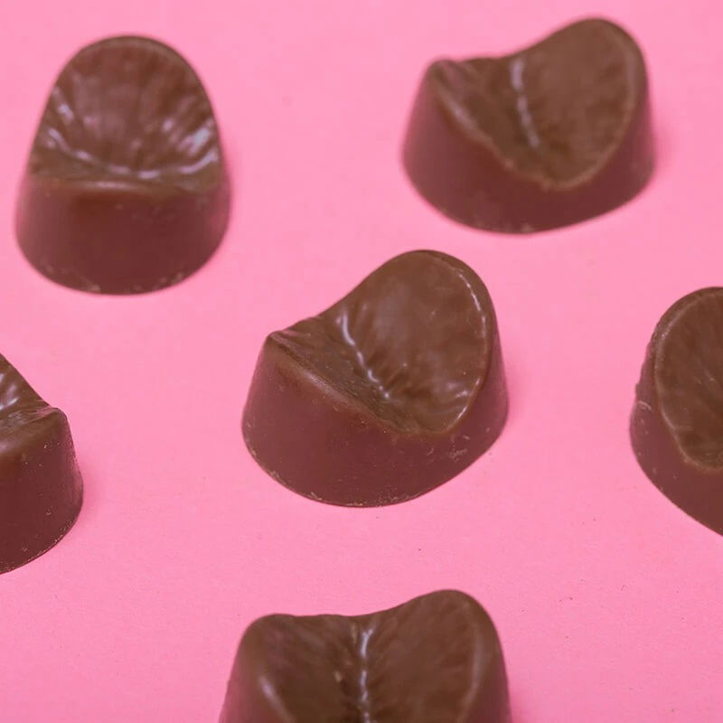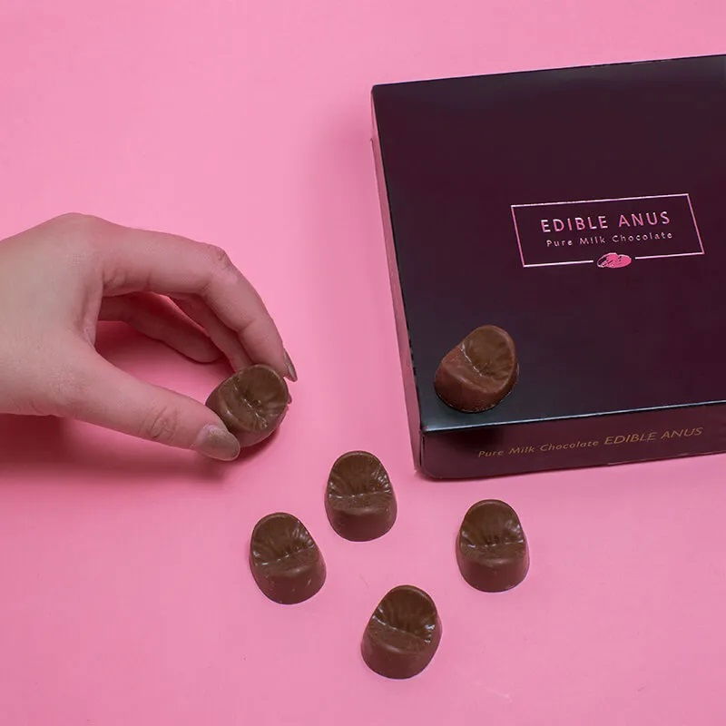 Cutia cu ciocolata anus comestibil, de un aspect chic, elegant, vine cu sase bomboane din acestea trasnite, din ciocolata pur belgiana. La cadouri amuzante, bomboanele acestea sunt imbatabile! Dupa ce vor gusta gluma, prietenii tai vor vrea sa guste si ciocolata. Iata ce ingrediente au: Ciocolata cu lapte (34% masa de cacao, 22% lapte in substanta solida - masa de cacao, unt de cacao, lecitina de soia, vanilie naturala). Ciocolata anus comestibil vine ambalata intr-o cutie eleganta cu lungimea de 11 centimetri, latimea de 4 si inaltime 3 centimetri. Numai buna de facut cadou!