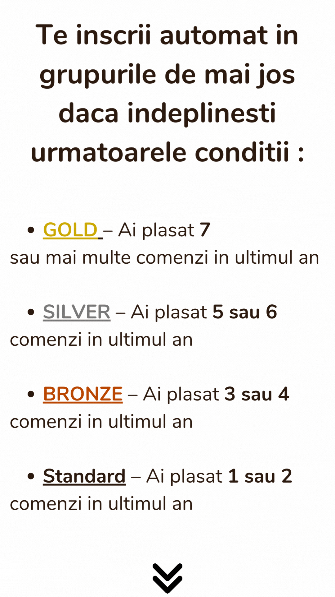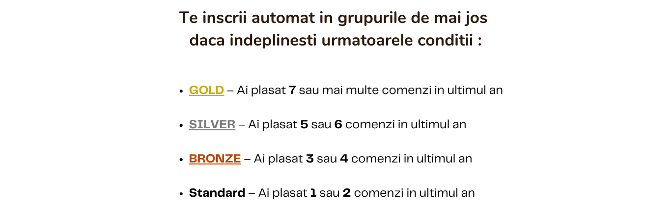Dacă sunteți deja client si ati plasat cel putin 1 comanda atunci puteți verifica în contul dvs. în ce grup sunteți încadrat și să începeți să beneficiați de toate avantajele.