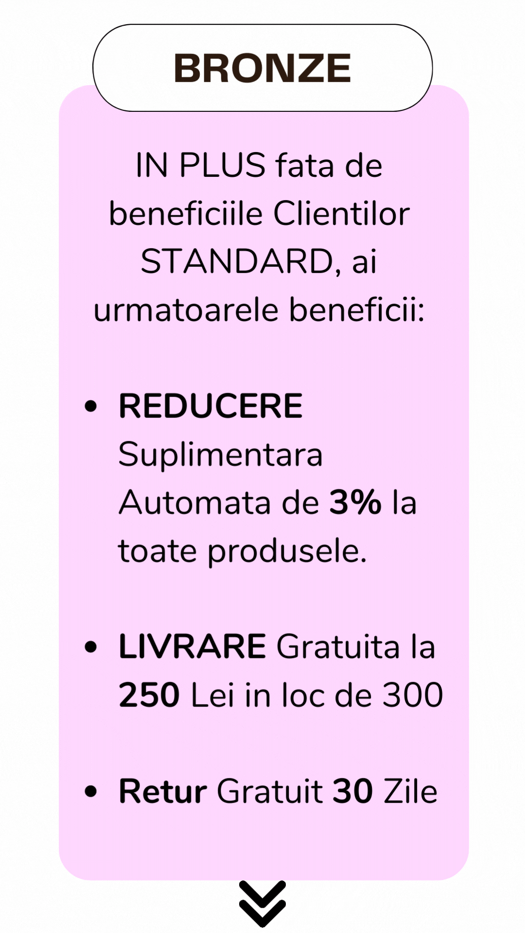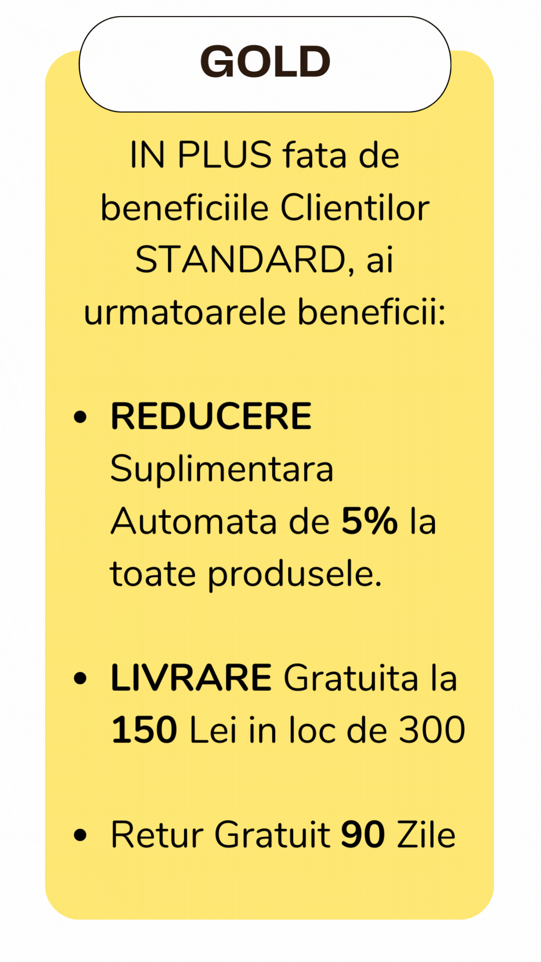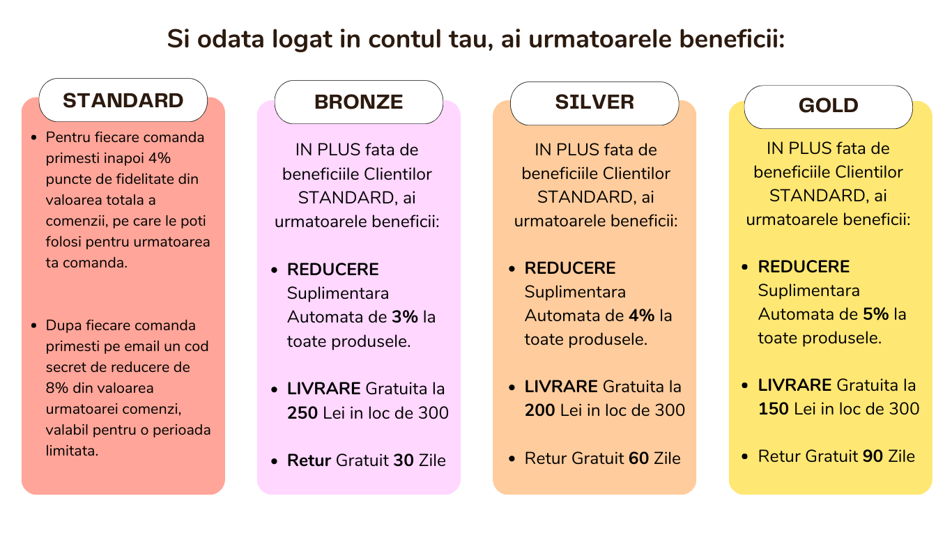 Astfel, am creat un program de fidelitate care oferă beneficii speciale pentru fiecare dintre grupurile noastre de fidelitate: Standard, Bronze, Silver și Gold.
