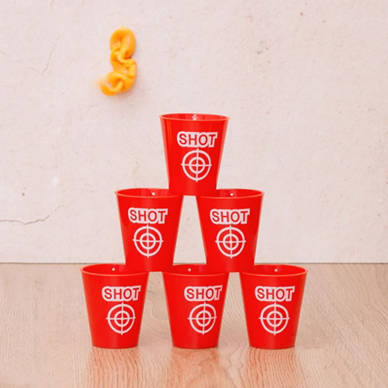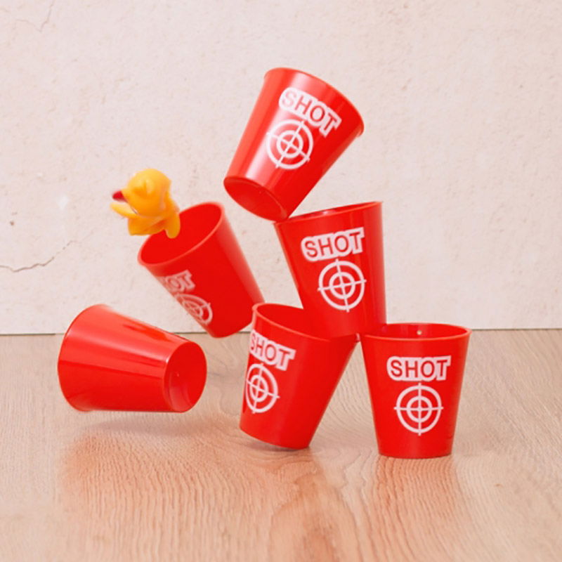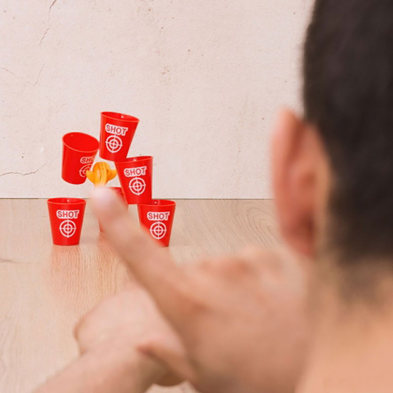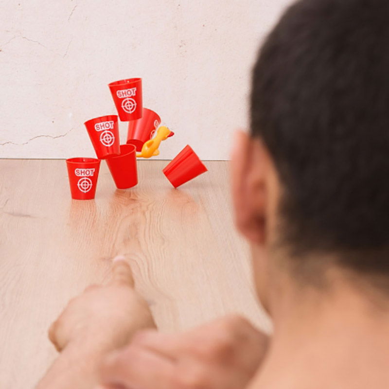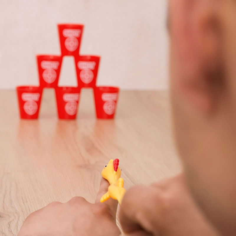 Pozitioneaza o gaina pe degetul aratator si cel mare si tinteste atent tinte. Nu e loc de greseli! Trage usor de codita gainii astfel incat sa darami cat mai multe pahare aranjate sub forma de piramida. Let the party begin!