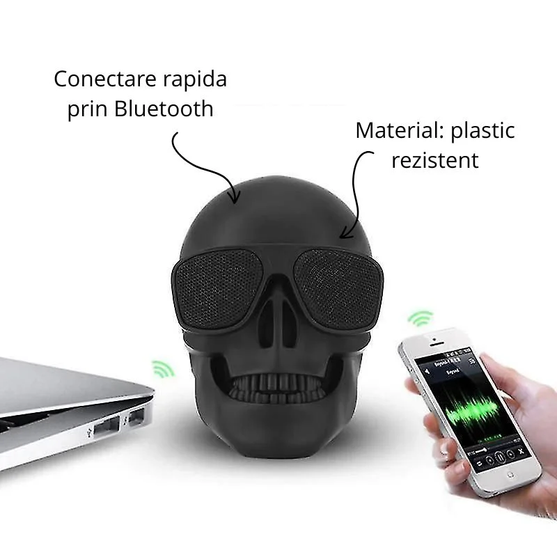 Boxa portabila Bluetooth Craniu este combinația perfecta dintre funcționalitate modernă și design îndrăzneț. Cu o formă de craniu dotat cu ochelari cool, această boxă adaugă un aer rebel biroului, camerei sau picnicurilor tale. Este companionul ideal pentru orice petrecere spontană sau sesiune de ascultat muzică în stil mare.