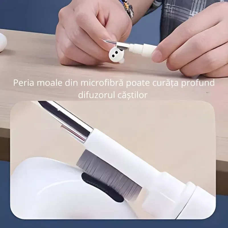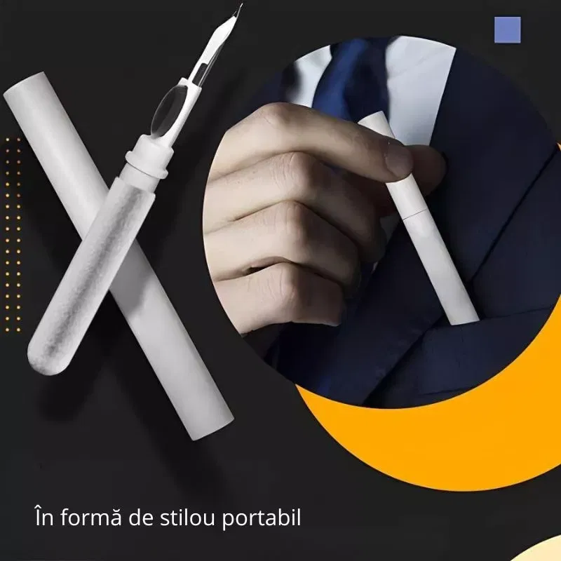 Vine cu 3 ustensile specializate si delicate, un burete flexibil si moale pentru curatarea carcasei castilor, de exemplu, alaturi de o periuta laterala fina menita sa faca praful puff. Varful metalic in forma de stilou iti permite sa indepartezi orice urma de murdarie mai profunda care are nevoie de multa precizie in actiune pentru a preveni un adevarat dezastru. Si compatibil inclusiv cu telefonul, cu tableta sau orice alt gadget pe care-l ai frecvent la indemana.