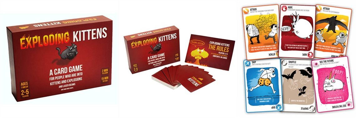 Utilizare: Cum se joaca: Jucatorii iau carti din pachet pana cand cineva se alege cu o carte Exploding Kittens, moment in care explodeaza, moarte si iese din joc – asta daca, nu cumva, jucatorul cu cartea exploziva se intampla sa aiba si un Defuse Card. Aceste carti au rolul de a distrage/dezarma pisicile ucigase folosind proprietatiile magice ale unui laser pointer (doar stii ca pisicile il adora), a mangaierilor pe burtica sau ale unor sandvisuri cu iarba matei. Toate celelalte carti, nastrusnic ilustrate, din pachet modifica cursul jocului, ajuta la strecuratul cartilor in pachet, ataca alti jucatori si evita cartile cu pisici explozive. Cu cat joci mai mult, cu atat iti cresc sansele de a exploda, jocul devenind din ce in ce mai intens. Sprancene transpirate, unghii roase si momente de anxietate garantate.