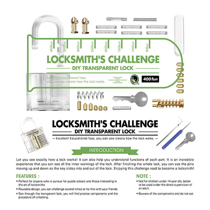 Ofera-i acest Lacatul transparent, provocare puzzle 3D si se va bucura enorm. Pentru ca are un invelis dintr-un material plastic translucid, practic poti sa vezi cu usurinta tainele care se ascund intr-un lacat - si sa stii ca nu-i putin acest lucru. O sa fii uimit cat de intortocheat poate fi un lacat pe interior. Astfel, o sa poti distinge camera interioara a lacatului, alinierea cilindrului, precum si cei 7 pini.
