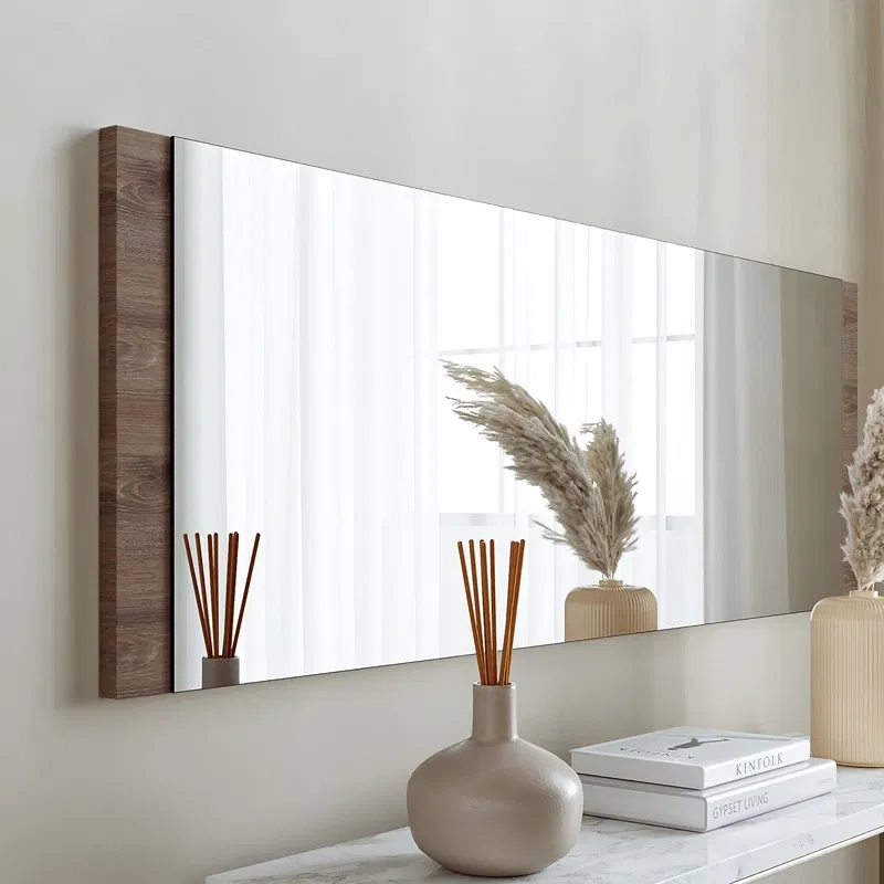 Oglinda dreptunghiulara accent nuc este o piesa decorativa moderna, ideala pentru orice spatiu care necesita luminozitate si profunzime. Cu un design minimalist si elegant, aceasta poate fi montata atat pe verticala, cat si pe orizontala, in functie de preferinte.