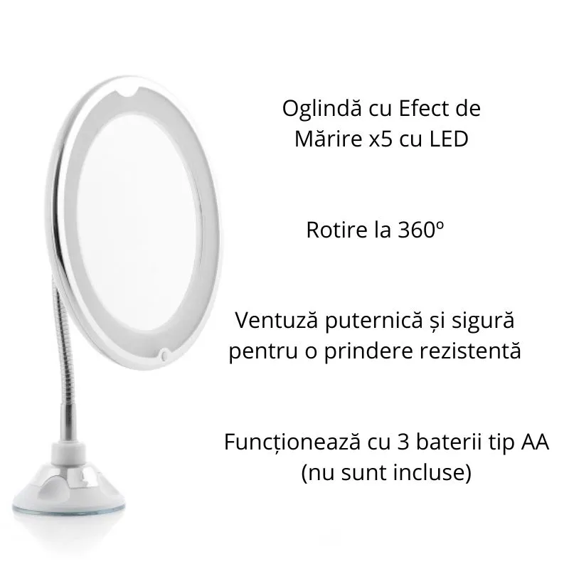 Utilizare: Amplaseaz-o in locurile preferate si, folosindu-te de piciorul flexibil si ventuzele din dotare stabileste-i pozitia optima. Alege sa te vezi mai frumoasa de pana la 5 ori mai bine cu aceasta Oglinda machiaj cu becuri led, maleabila. Apasa in centru pentru ca efectul de luminozitate LED sa iasa la iveala si sa te vezi frumoasa chiar si in conditii de iluminare slaba.