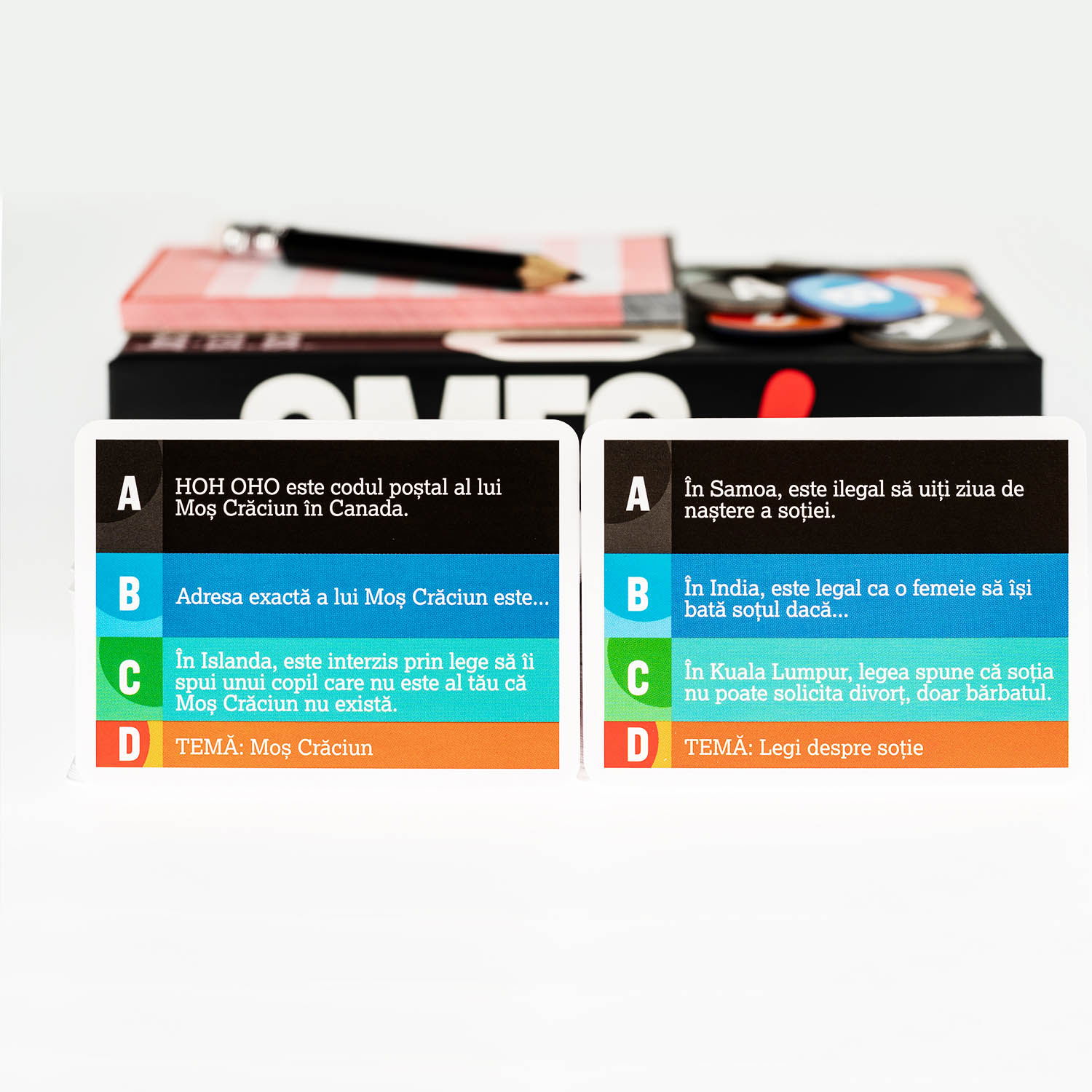 Jucand OMFG! vei descoperi pe cartonasele de joc multe lucruri scandaloase, jenante, ciudate si tulburatoare, fie adevarate, fie false, pe baza carora va veti amuza copios in timpul jocului!