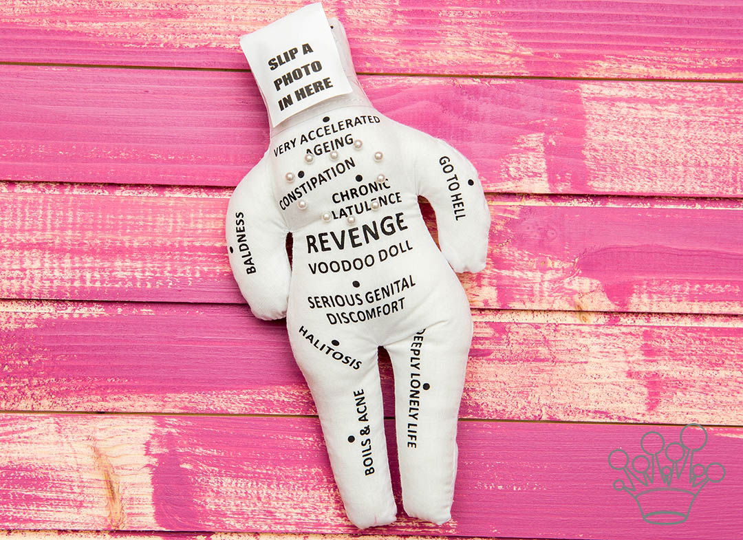 • Papusa vine la pachet cu ace de infipt, un locsor in care sa lipesti poza celui pe care ai vrea sa te razbuni si divere sloganuri&cuvinte • Cuvinte care sigur or sa te amuze: constipated, deeply lonely life, malitious, chronic flatulence • Material papusa: poliester alb • Dimensiuni: 27.2×12×5 cm • Greutate: 95 gr.