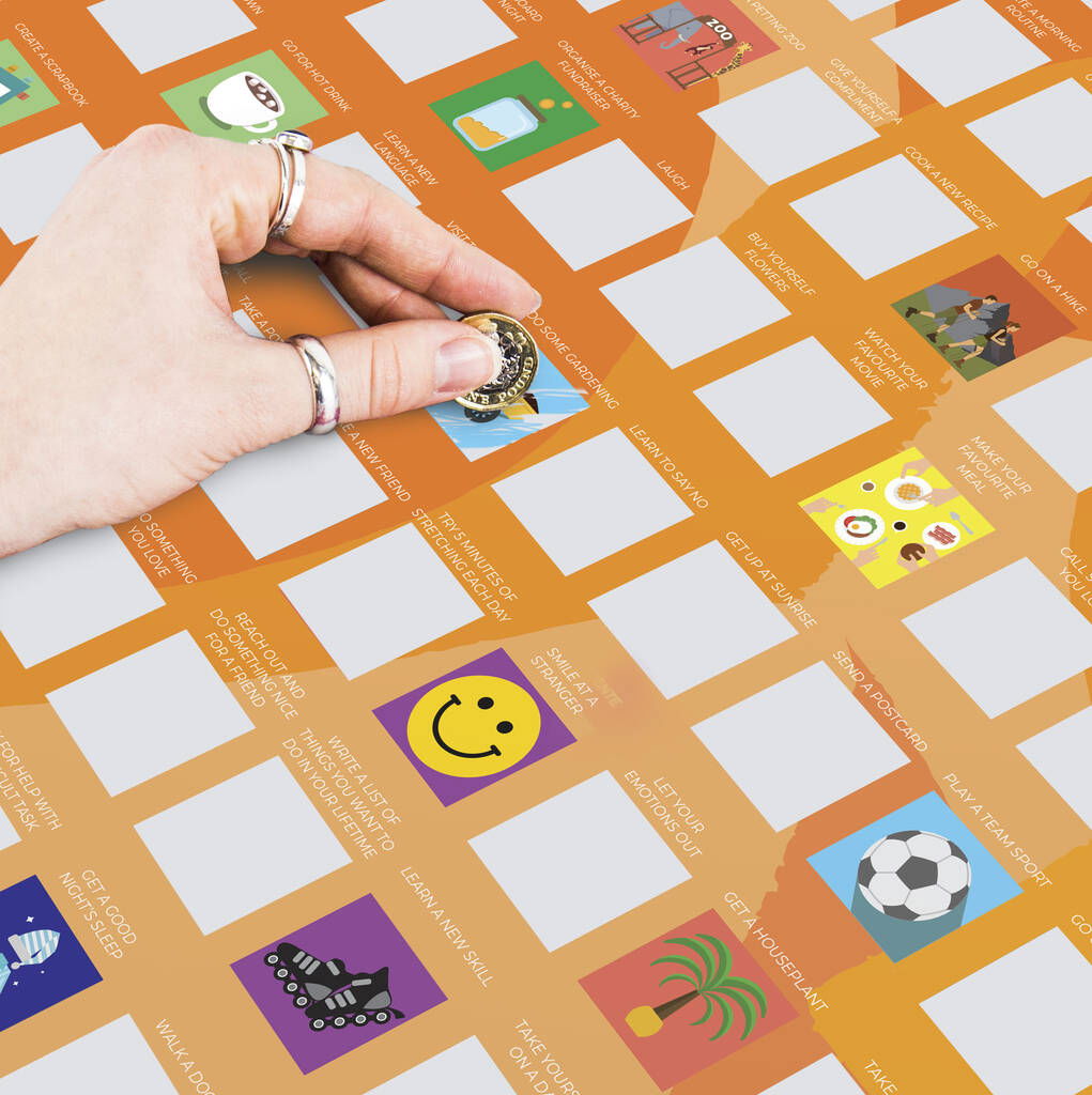 Ideea e super simpla si sigur ca te-ai prins deja. Agata posterul pe perete (sau pune-l sub perna daca vrei sa-l tii departe de ochii curiosilor) si incepe sa bifezi provocarile. Pe masura ce faci ceea ce este mentionat acolo, ai dreptul sa marchezi terenul - adica sa razuiesti patratul aferent provocarii. In spatele fiecarui patratel se ascund fel si fel de iconite simpatice, astfel ca la final, dupa ce vei razui toate cele 100 de provocari, vei avea un minunat tablou al eforturilor tale de wellbeing.