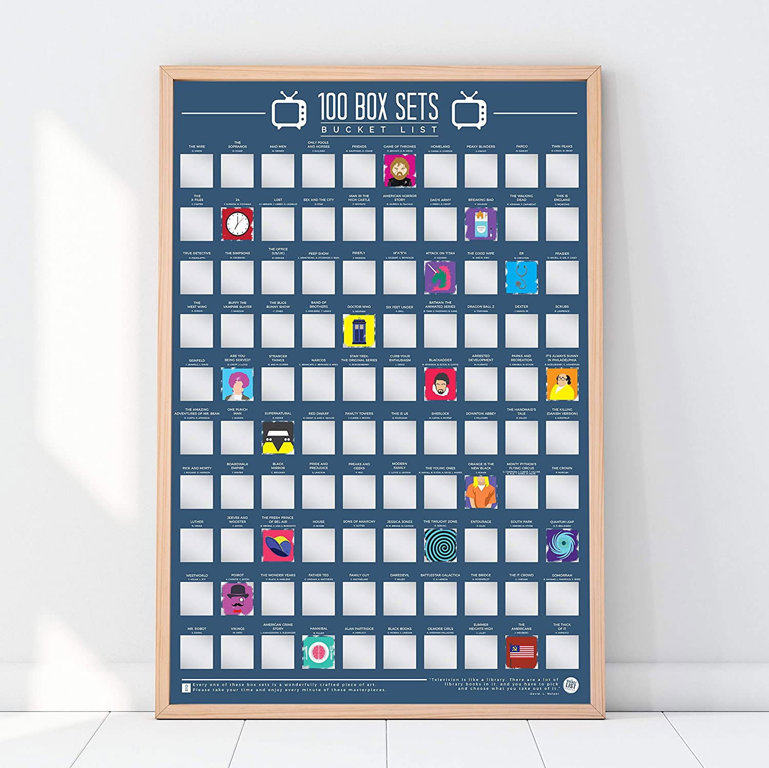 Fiecare Poster razuibil 100 Serii TV contine 100 de sugestii de filme care au facut furori in intreaga lume, multe pe care cel mai probabil inca nu ai apucat sa le vizionezi. Astfel, acest poster nu doar ca-ti ofera intreaga inspiratie de care ai nevoie atunci cand nu stii ce sa mai vizionezi, dar te umple si de satisfactie cu fiecare casuta redescoperita. Te asteapta scenete, personaje animate, multa satisfactie la razuit, pe care-ti vei dori sa n-o imparti cu nimeni.