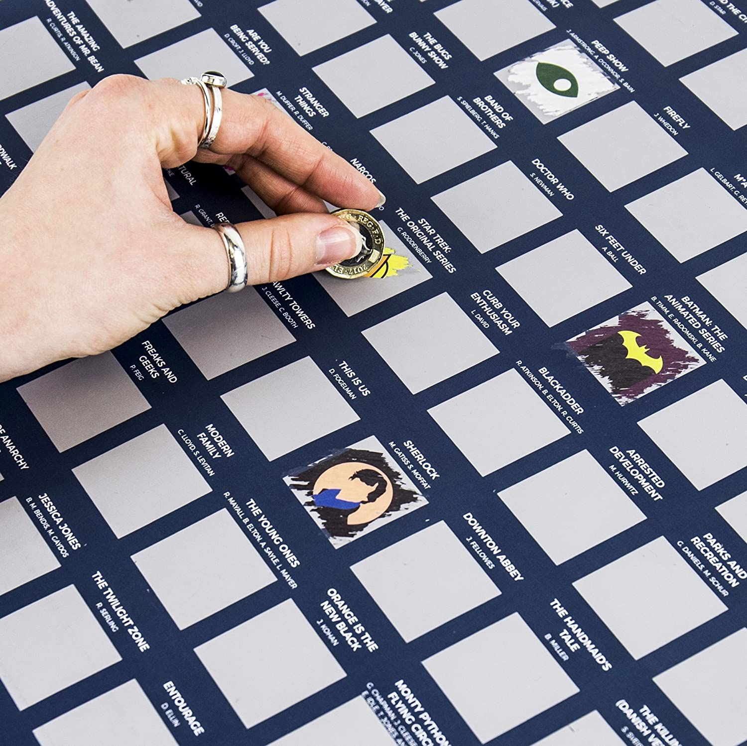 Utilizare: Bucura-te de imaginea unui poster adresat fanilor infocati de serii TV care au cucerit lumea. Razuieste cu ajutorul unei monede fiecare cutiuta si bucura-te de 100 de sugestii de film care trebuie sa le adaugi in colectia de vizionate.